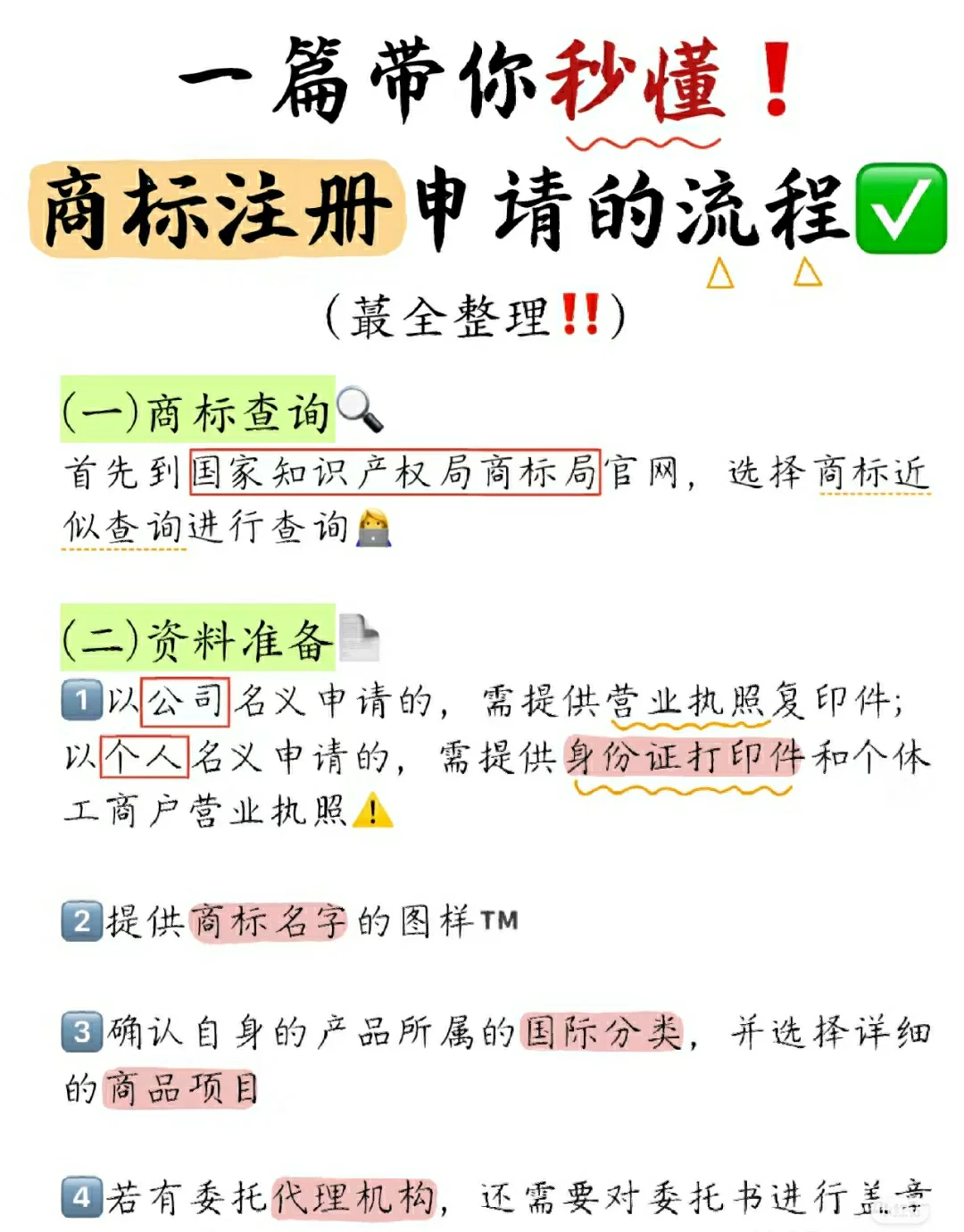 一篇能讓你在幾秒鐘內(nèi)理解的文章!商標(biāo)注冊(cè)申請(qǐng)流程五 (1) 商標(biāo)查詢 首先,進(jìn)入中國(guó)國(guó)家知識(shí)產(chǎn)權(quán)局商標(biāo)局官網(wǎng),選擇商標(biāo)近似查詢進(jìn)行查詢 (2) 數(shù)據(jù)準(zhǔn)備 如果以公司名義申請(qǐng),則需要營(yíng)業(yè)執(zhí)照副本: 如果以個(gè)人名義申請(qǐng),必須提供其身份證打印件和個(gè)體工商戶營(yíng)業(yè)執(zhí)照! 提供商標(biāo)名稱?的設(shè)計(jì) 3.確認(rèn)您的產(chǎn)品的國(guó)際分類,并選擇詳細(xì)的產(chǎn)品項(xiàng)目 如果有委托代理機(jī)構(gòu),還需要在授權(quán)書(shū)上蓋章或簽字 (3) 提交申請(qǐng) 提供相應(yīng)的聯(lián)系人和地址。成功提交流程后,進(jìn)行現(xiàn)場(chǎng)付款或等待付款通知 (4) 費(fèi)用的支付 目前,中國(guó)每個(gè)類別一個(gè)商標(biāo)的成本為270元(10種產(chǎn)品) (5) 正在等待審核結(jié)果 提交后,它將在大約3-4周內(nèi)被接受,并將發(fā)出接受通知。實(shí)質(zhì)性審查將在收到驗(yàn)收通知后約3-6個(gè)月內(nèi)進(jìn)行 (6) 評(píng)審結(jié)果有三種類型 預(yù)審公告(所有產(chǎn)品均已通過(guò)評(píng)審) 所有被拒絕(所有產(chǎn)品都無(wú)法注冊(cè)) 部分拒絕(有些產(chǎn)品可以注冊(cè),有些不能注冊(cè)) (7) 公告期17 初次審查公告通過(guò)后,初次審查公告期為3個(gè)月,期間不公開(kāi)提出異議。隨后,可以頒發(fā)商標(biāo)注冊(cè)證書(shū) 提交后,它將在大約3-4周內(nèi)被接受,并將發(fā)出接受通知。實(shí)質(zhì)性審查將在收到驗(yàn)收通知后約3-6個(gè)月內(nèi)進(jìn)行 (6) 評(píng)審結(jié)果有三種類型 預(yù)審公告(所有產(chǎn)品均已通過(guò)評(píng)審) 所有被拒絕(所有產(chǎn)品都無(wú)法注冊(cè)) 部分拒絕(有些產(chǎn)品可以注冊(cè),有些不能注冊(cè)) (7) 公告期17 初審公告通過(guò)后,初審公告期為3個(gè)月,期間不得公開(kāi)異議,后續(xù)可頒發(fā)商標(biāo)注冊(cè)證書(shū) (8) 已成功頒發(fā)證書(shū) 注冊(cè)成功后,頒發(fā)注冊(cè)證書(shū)。商標(biāo)申請(qǐng)過(guò)程順利,取證耗時(shí)約8-10個(gè)月√ 注意該商標(biāo)有效期為10年,每10年需要更新一次!