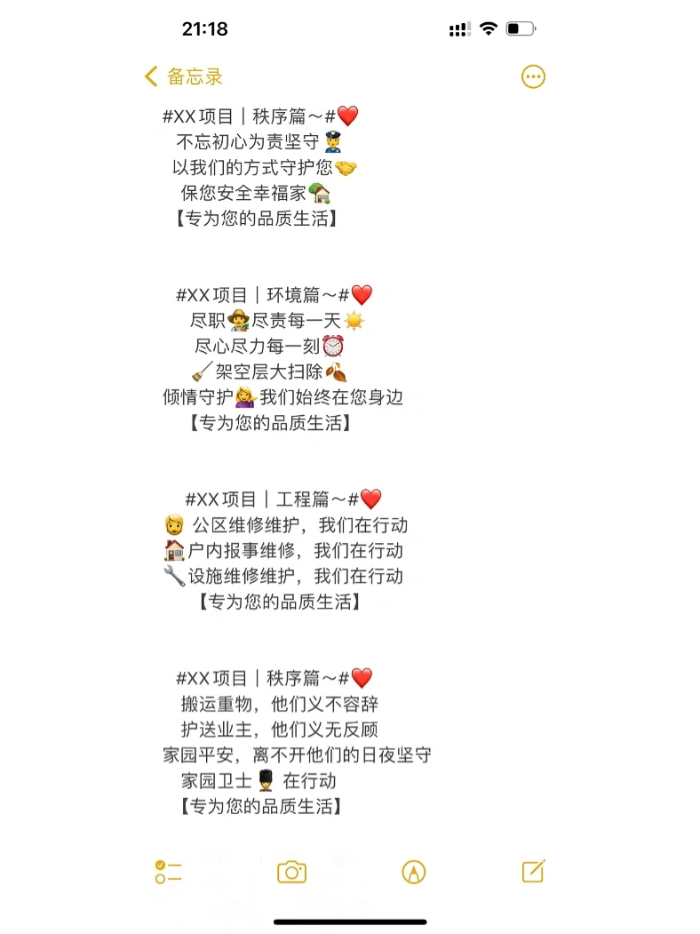 天氣突變時(shí)記得穿好衣服嗎 您是否完全滿足您的專屬要求 你心里有責(zé)任感,肩上有責(zé)任感 我們會(huì)把我們的心放進(jìn)你的心里,你會(huì)更暖心嗎 -清潔部 清潔部門每天都清理小區(qū)里的落葉嗎 關(guān)心社區(qū)每一個(gè)角落的清潔與寧靜 時(shí)間在前進(jìn),時(shí)間在安靜~ 你平靜的微笑 這是我們繼續(xù)前進(jìn)的動(dòng)力嗎 |環(huán)境章節(jié)~ 盡職調(diào)查每天承擔(dān)責(zé)任 專注于每一刻 空中地板清潔 專門負(fù)責(zé)守衛(wèi)♀? 我們永遠(yuǎn)在你身邊 [專為您的生活質(zhì)量而設(shè)計(jì)] 【XX公司?XX項(xiàng)目】 -----訂單章節(jié) 保安武裝巡邏 總有一盞燈為你點(diǎn)亮嗎 有一群人在等你回家嗎 成千上萬的禮貌問候和安全護(hù)送 只是為了讓你享受回家的時(shí)刻 |坐電梯安全嗎,安全出行 確保電梯的安全運(yùn)行并保護(hù)業(yè)主人身安全! [管家溫馨提醒] 乘坐電梯時(shí)請(qǐng)注意腳部安全! 電梯運(yùn)行時(shí),請(qǐng)不要玩?;蛱S! 在電梯內(nèi)攜帶寵物時(shí),應(yīng)對(duì)寵物進(jìn)行有效控制,不允許寵物在電梯轎廂內(nèi)隨意大小便! 文明乘坐電梯,不要用硬物敲擊或損壞電梯轎廂內(nèi)的各種按鈕設(shè)施! 不要用物體阻止電梯廳門關(guān)閉或強(qiáng)行操作電梯! 如果發(fā)現(xiàn)任何電梯故障或異常,請(qǐng)立即通知物業(yè)服務(wù)中心!