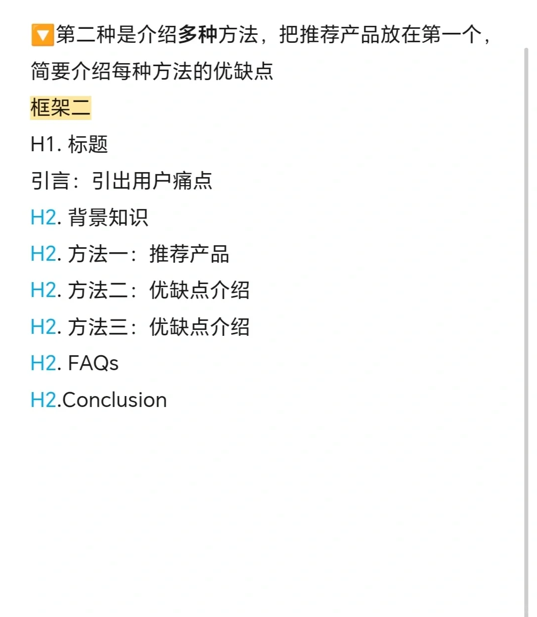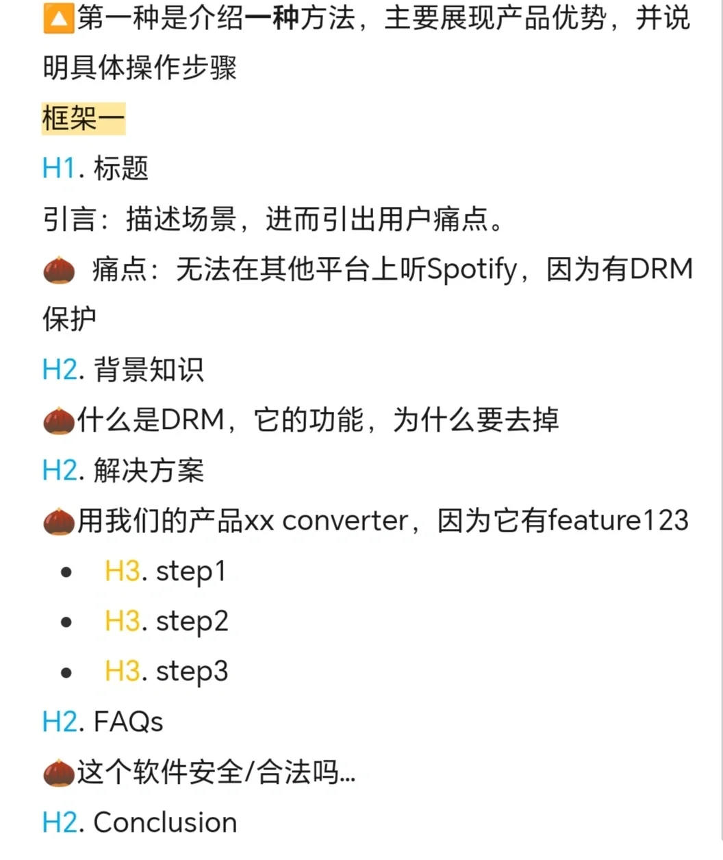 如何分類是提高SEO排名和產(chǎn)品轉(zhuǎn)化率最常見和最有效的類別。 常見的文章結(jié)構(gòu)主要有兩種類型。 第一種是單向 H1.標(biāo)題 簡介:描述場景,然后介紹用戶的痛點(diǎn)。 痛點(diǎn):由于DRM保護(hù),無法在其他平臺上收聽Spotify H2.背景知識 什么是DRM,它的功能,以及為什么要?jiǎng)h除它 H2.溶液 使用我們的產(chǎn)品xx轉(zhuǎn)換器,因?yàn)樗哂泄δ?23 H3步驟1 H3步驟2 H3步驟3 H2.常見問題 這個(gè)軟件安全/合法嗎 H2.結(jié)論 第二種方法是引入多種方式 H1.標(biāo)題 簡介:介紹用戶痛點(diǎn) H2.背景知識 H2.方法1:推薦產(chǎn)品 H2.方法2:優(yōu)缺點(diǎn)介紹 H2.方法三:優(yōu)缺點(diǎn)介紹 H2.常見問題 H2.結(jié)論