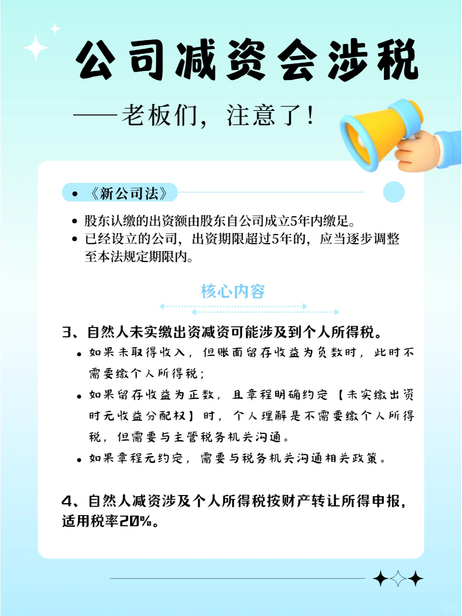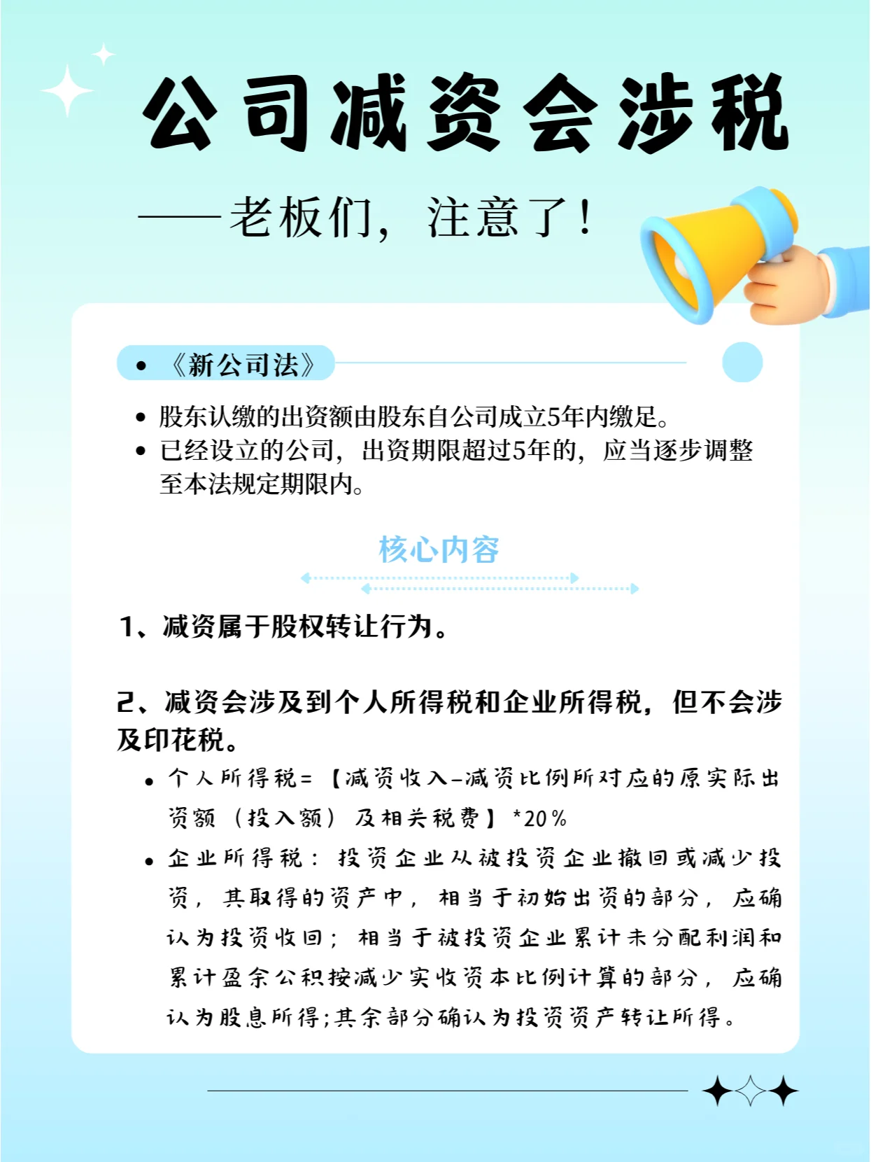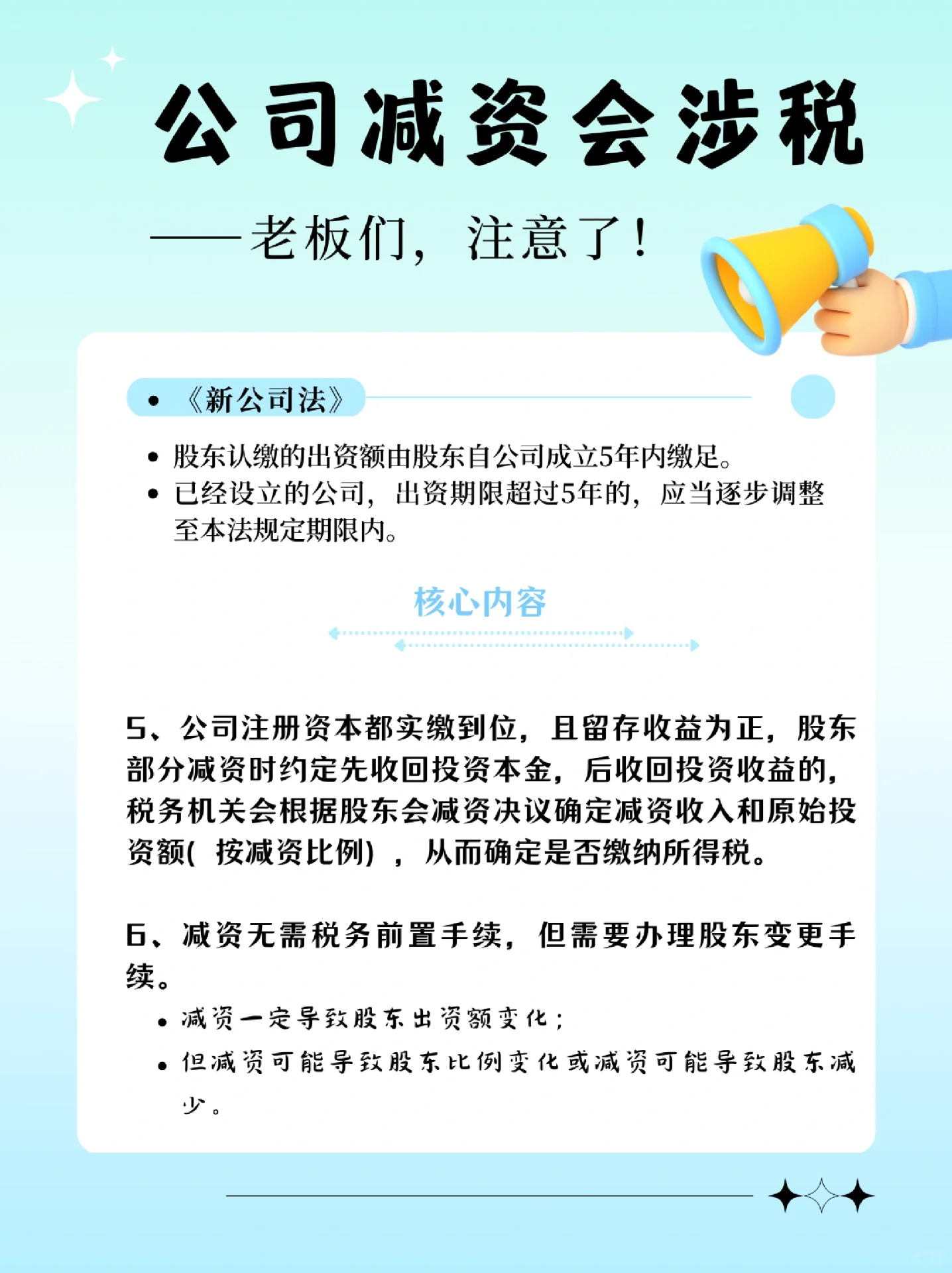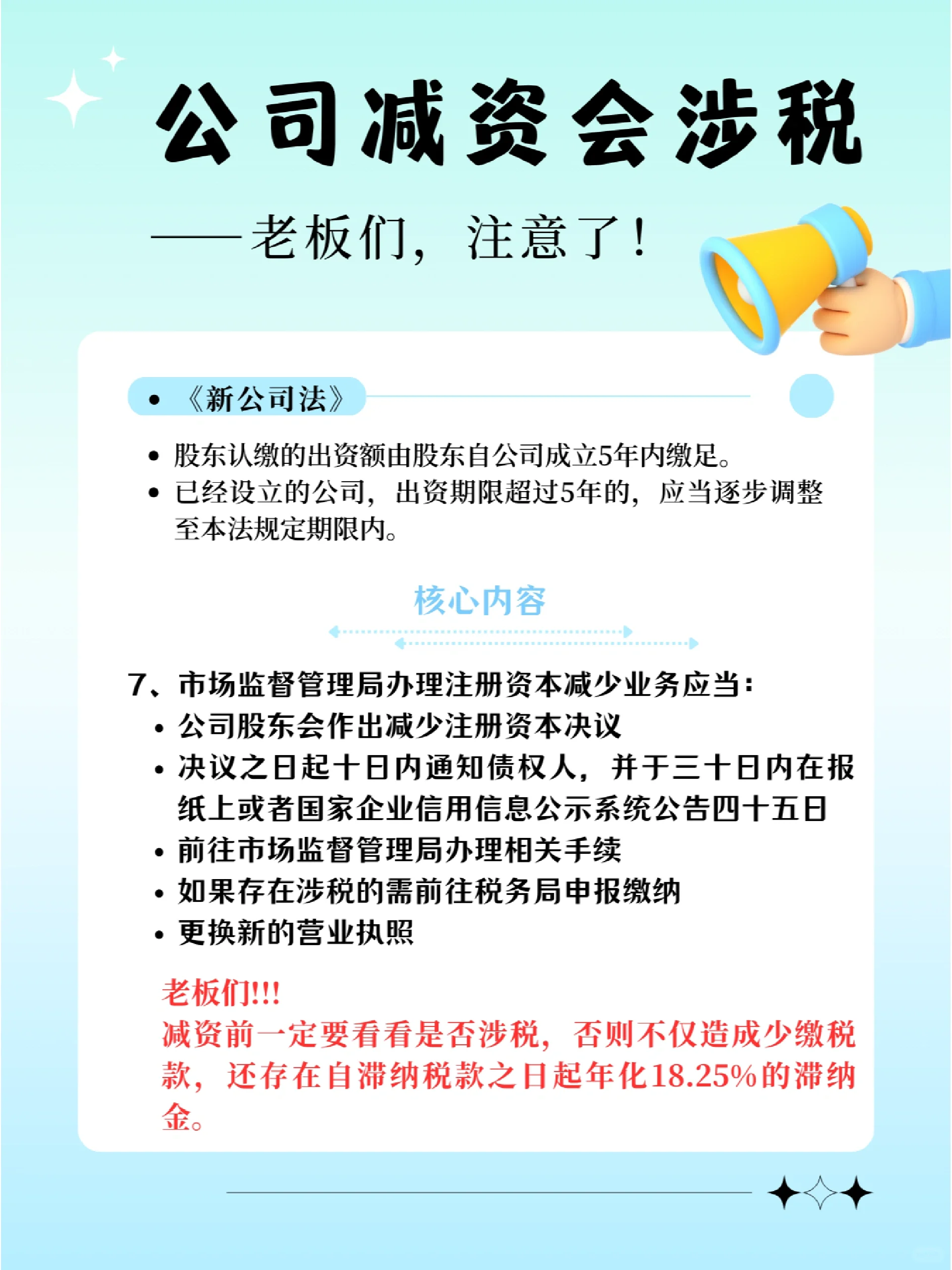 新修訂的《公司法》明確規(guī)定: 股東認(rèn)繳的出資額應(yīng)當(dāng)自公司成立之日起5年內(nèi)繳足; 已設(shè)立的公司的出資期限超過五年的,應(yīng)當(dāng)逐步調(diào)整為本法規(guī)定的出資期限。 以至于許多在認(rèn)繳制度下沒有完成實際出資的企業(yè)開始減少資本 但由于缺乏減持注冊資本的稅務(wù)前置程序,多數(shù)人認(rèn)為,整個流程只需到市場監(jiān)督管理局辦理減持注冊資金業(yè)務(wù)即可。 完全無視稅收問題 將稅務(wù)風(fēng)險留給未來解決, 這是關(guān)于再次納稅 又是滯納金, 還有罰款,得不償失 : : 那么 在減少資本之前,記得檢查是否涉及納稅,以避免稅務(wù)風(fēng)險! 在減資期間,請記住遵守通知債權(quán)人的相關(guān)程序,以避免法律風(fēng)險! 如果涉及到非貨幣性資產(chǎn)的減少,就要做好稅收籌劃!