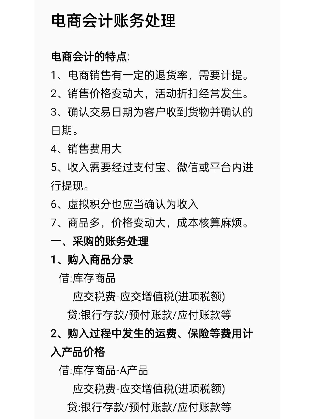 會計|會計實務(wù)|電子商務(wù)企業(yè)的會計處理 電子商務(wù)會計的特點: 1.電子商務(wù)銷售具有一定的收益率,需要計提預(yù)計負債。 2、銷售價格波動較大,促銷折扣時有發(fā)生,需要精確計算銷售收入。 3.確認交易日期是指客戶收到貨物并確認的日期。 4.銷售費用高 5.收入需要通過支付寶、微信或平臺導(dǎo)入 資金提取。 6.虛擬積分也應(yīng)確認為收入 7.價格波動較大的產(chǎn)品很多,使成本核算更加復(fù)雜。 |采購、銷售和相關(guān)部門的一般費用分錄 如圖所示。