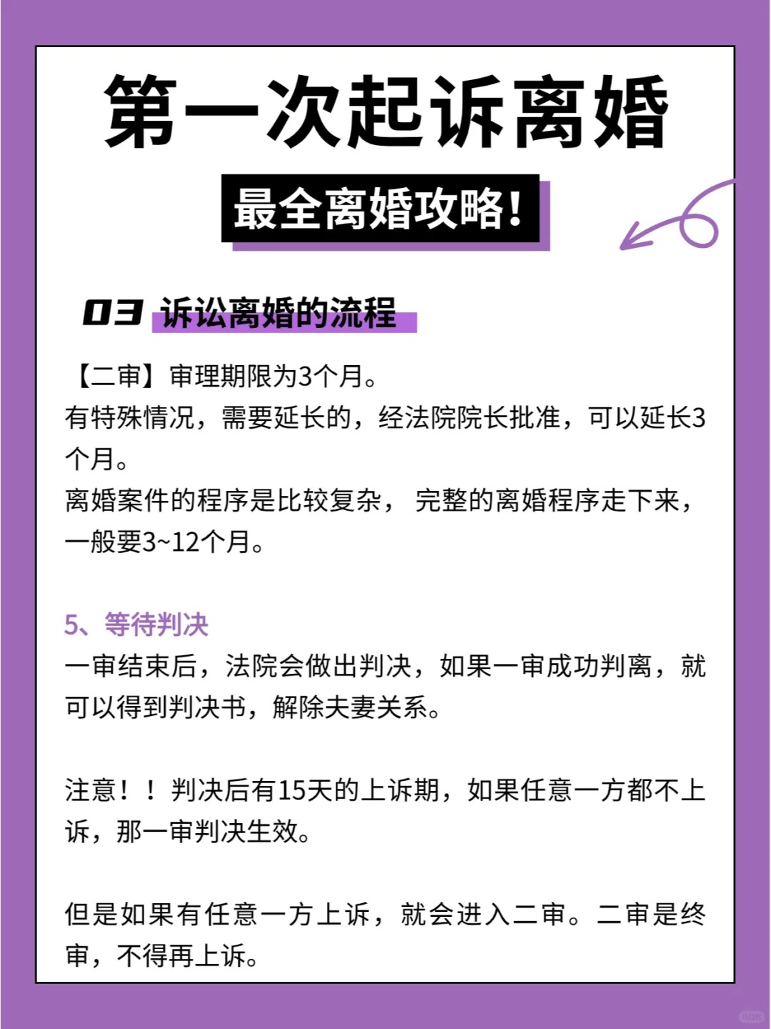 一、離婚方式怎么選? 一般離婚方式有2種:協(xié)議離婚和訴訟離婚。 協(xié)議離婚比較適用于雙方自愿離婚,沒有其他爭議的時(shí)候。 訴訟離婚適用于雙方對財(cái)產(chǎn)分割、子女撫養(yǎng)權(quán)、債務(wù)承擔(dān)等問題,不能達(dá)成一致時(shí),建議選擇訴訟離婚。 相對來說,訴訟離婚法律效力較高、執(zhí)行力度大,能夠較全面的解決問題。 二、準(zhǔn)備哪些材料? 離婚起訴狀; 雙方結(jié)婚證; 本人戶口簿; 本人身份證; 子女的戶口簿或出生證明; 證明夫妻感情破裂的證據(jù); 證明家庭財(cái)產(chǎn)狀況的證據(jù)。 三、訴訟離婚的流程 1、寫起訴狀 離婚起訴狀需要寫明: ①原被告的姓名、性別、年齡、身份證號(hào)、聯(lián)系方式等基本信息。 ②訴訟請求及所依據(jù)的事實(shí)理由。 ③證據(jù)和證據(jù)來源。 ④起訴時(shí)所遞交人民法院的名稱、具狀人、起訴時(shí)間等內(nèi)容。 2、辦理立案 到住所地所屬的區(qū)、縣法院,辦理立案手續(xù),立案時(shí),要遞交上述準(zhǔn)備的材料。然后就是等待審核→完成繳費(fèi)。立案后就可以在家等待法院通知調(diào)解或者開庭的時(shí)間。 3、庭前調(diào)解 一般開庭之前,法官會(huì)先召集雙方當(dāng)事人到法院接受調(diào)解,如果調(diào)解成功,法院會(huì)出具調(diào)解書,解除婚姻關(guān)系證明,離婚成功。如果有一方明確表示不愿意接受調(diào)解,那么法官會(huì)省去這一環(huán)節(jié),直接進(jìn)入開庭審理程序。 4、開庭審理 【一審】有普通程序和簡易程序。 簡易程序的審理期限為3個(gè)月,適用于事實(shí)比較清楚、權(quán)利義務(wù)關(guān)系明確的簡單離婚案件。普通程序可以延長6個(gè)月。 【二審】審理期限為3個(gè)月。 有特殊情況,需要延長的,經(jīng)法院院長批準(zhǔn),可以延長3個(gè)月。 離婚案件的程序是比較復(fù)雜, 完整的離婚程序走下來,一般要3~12個(gè)月。 5、等待判決 一審結(jié)束后,法院會(huì)做出判決,如果一審成功判離,就可以得到判決書,解除夫妻關(guān)系。 注意!!判決后有15天的上訴期,如果任意一方都不上訴,那一審判決生效。但是如果有任意一方上訴,就會(huì)進(jìn)入二審。二審是終審,不得再上訴。 同時(shí)大家要明白,人民法院審理離婚案件,準(zhǔn)予或不準(zhǔn)離婚應(yīng)以夫妻感情是否確已破裂作為區(qū)分的界限。 判斷夫妻感情是否確已破裂,應(yīng)當(dāng)從婚姻基礎(chǔ)、婚后感情、離婚原因、夫妻關(guān)系的現(xiàn)狀和有無和好的可能等方面綜合分析。 民法典第1079條規(guī)定:夫妻一方要求離婚的,可以由有關(guān)組織進(jìn)行調(diào)解或者直接向人民法院提起離婚訴訟。 人民法院審理離婚案件,應(yīng)當(dāng)進(jìn)行調(diào)解;如果感情確已破裂,調(diào)解無效的,應(yīng)當(dāng)準(zhǔn)予離婚。 有下列情形之一,調(diào)解無效的,應(yīng)當(dāng)準(zhǔn)予離婚: (一)重婚或者與他人同居; (二)實(shí)施家庭暴力或者虐待、遺棄家庭成員; (三)有賭博、吸毒等惡習(xí)屢教不改; (四)因感情不和分居滿二年; (五)其他導(dǎo)致夫妻感情破裂的情形。 一方被宣告失蹤,另一方提起離婚訴訟的,應(yīng)當(dāng)準(zhǔn)予離婚。 經(jīng)人民法院判決不準(zhǔn)離婚后,雙方又分居滿一年,一方再次提起離婚訴訟的,應(yīng)當(dāng)準(zhǔn)予離婚。 如果您遇到了類似的糾紛,需要幫助的,歡迎咨詢!