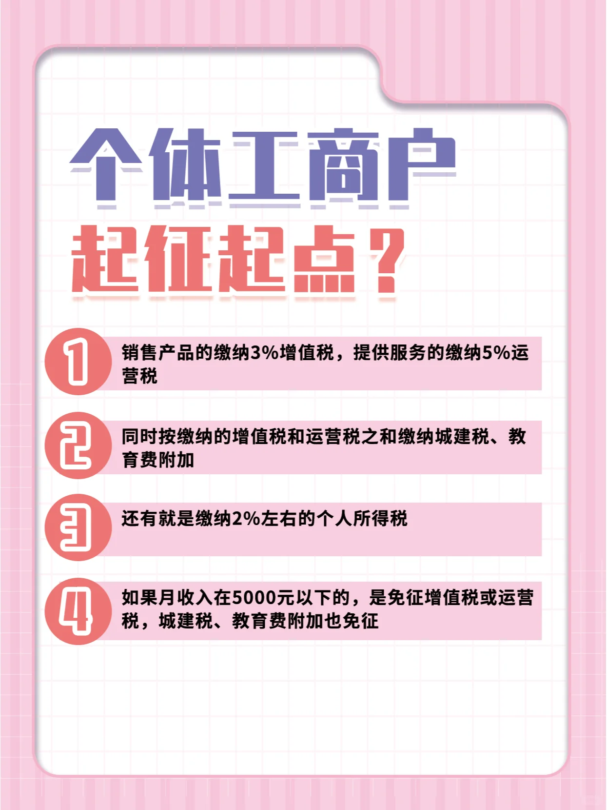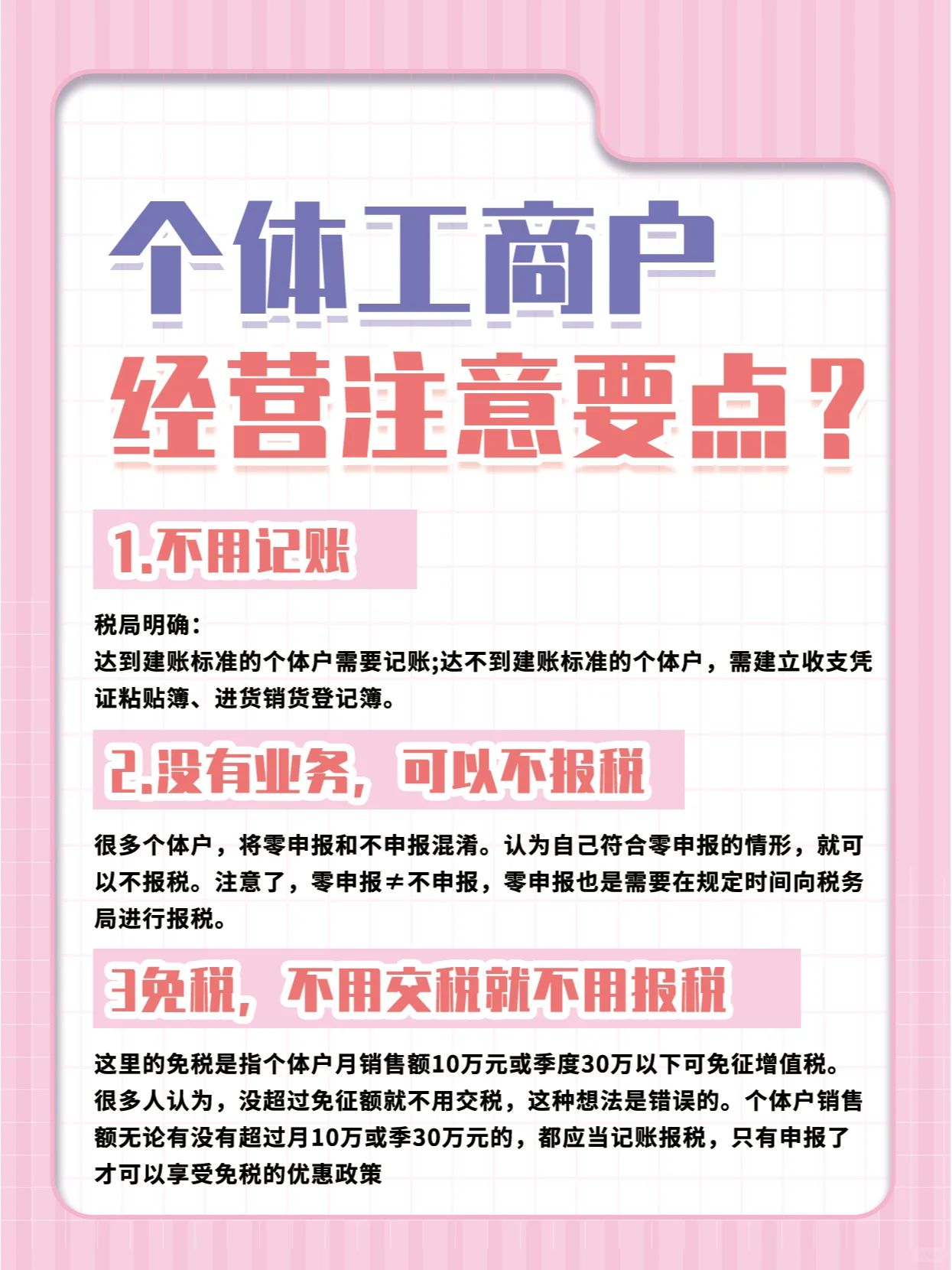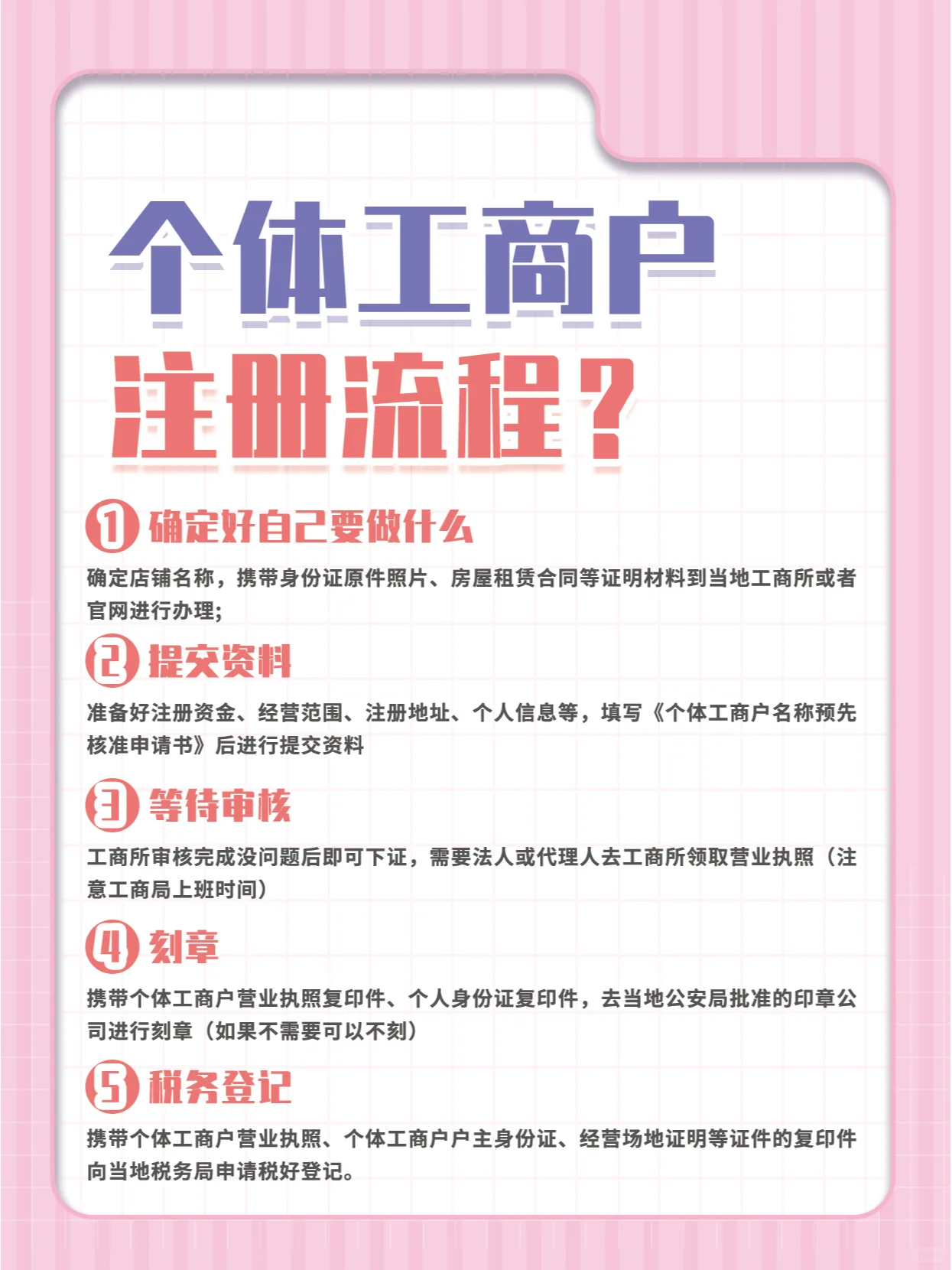 1.確定你想做什么 確定店名,攜帶身份證照片原件、租房合同等證明文件到當(dāng)?shù)毓ど趟蚬倬W(wǎng)辦理 2.材料提交 準(zhǔn)備好注冊(cè)資本、經(jīng)營(yíng)范圍、注冊(cè)地址、個(gè)人信息等,填寫“個(gè)人工商戶名稱預(yù)核準(zhǔn)申請(qǐng)表”,然后提交材料 3.等待審查 在工商局審查完成且沒(méi)有問(wèn)題后,可以頒發(fā)證書。法定代表人或代理人需到工商局領(lǐng)取營(yíng)業(yè)執(zhí)照(注意工商局工作時(shí)間) 4.篆刻 攜帶個(gè)體工商戶營(yíng)業(yè)執(zhí)照和個(gè)人身份證復(fù)印件到當(dāng)?shù)毓簿峙鷾?zhǔn)的印章公司刻制(如無(wú)必要,可省略) 5.稅務(wù)登記 攜帶個(gè)人營(yíng)業(yè)執(zhí)照復(fù)印件、個(gè)體工商戶身份證復(fù)印件、營(yíng)業(yè)場(chǎng)所證明到當(dāng)?shù)囟悇?wù)局辦理稅務(wù)登記。 個(gè)體企業(yè)主的起點(diǎn) 1.銷售產(chǎn)品需繳納3%的增值稅,提供服務(wù)需繳納5%的營(yíng)業(yè)稅 2.按繳納的增值稅和營(yíng)業(yè)稅之和,同時(shí)繳納城市建設(shè)稅和教育費(fèi)附加 3.此外,還要繳納2%左右的個(gè)人所得稅 月收入在5000元以下的,免征增值稅或營(yíng)業(yè)稅,以及城建稅和教育費(fèi)附加 個(gè)體工商戶經(jīng)營(yíng)應(yīng)注意的要點(diǎn) 1.無(wú)需核算 稅務(wù)局明確表示: 符合會(huì)計(jì)準(zhǔn)則的個(gè)體工商戶需要記賬;不符合會(huì)計(jì)準(zhǔn)則的個(gè)體工商戶需要建立收支憑證粘貼簿和購(gòu)銷登記簿。 2.沒(méi)有業(yè)務(wù),可以免稅 許多個(gè)體工商戶將零申報(bào)與無(wú)申報(bào)混為一談。如果你認(rèn)為自己有資格進(jìn)行零申報(bào),你可以避免報(bào)稅。注意,零申報(bào)≠不申報(bào),零申報(bào)還需要在規(guī)定時(shí)間內(nèi)向稅務(wù)局申報(bào)。 3.免稅,無(wú)需納稅,無(wú)需報(bào)稅 這里的免稅是指對(duì)月銷售額10萬(wàn)元或季度銷售額30萬(wàn)元以下的個(gè)體工商戶免征增值稅。許多人認(rèn)為,如果不超過(guò)免稅額,就沒(méi)有必要納稅,這是一個(gè)錯(cuò)誤的想法。無(wú)論個(gè)體工商戶的銷售收入是每月超過(guò)10萬(wàn)元還是每季度超過(guò)30萬(wàn)元,都應(yīng)該記錄并征稅。申報(bào)后才能享受免稅優(yōu)惠政策