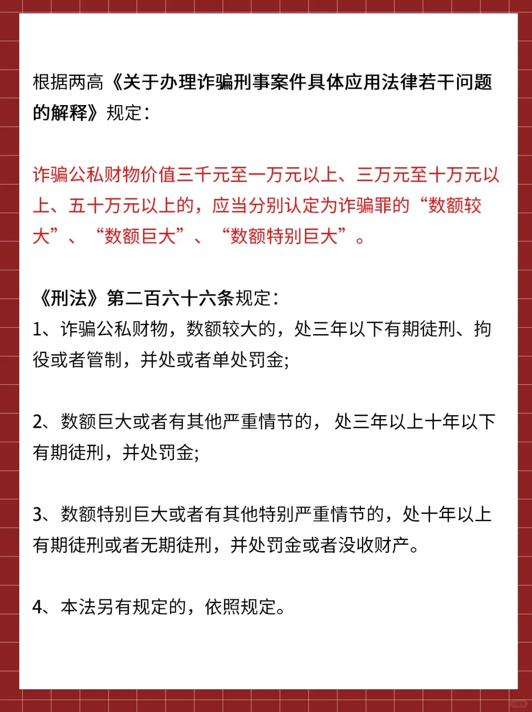首先,涉嫌詐騙需要滿足詐騙罪的各個標準,因為涉嫌詐騙具體量刑是根據(jù)實際情況來決定的,比如說犯罪情節(jié)、主觀程度、從輕情節(jié)等來決定的。涉嫌詐騙罪,應(yīng)當(dāng)符合犯罪的四個構(gòu)成要件: 1.客體要件,詐騙罪侵犯的客體是公私財物所有權(quán)。詐騙罪侵犯的對象,僅限于國家、集體或個人的財物,而不是騙取其他非法利益。 2.客觀要件,詐騙罪在客觀上表現(xiàn)為使用欺詐方法騙取數(shù)額較大的公私財物。也就是指行為人實施了欺詐行為,受害人產(chǎn)生了錯誤認識,并作出財產(chǎn)處分,而讓行為人獲得財產(chǎn),使被害人的財產(chǎn)受到損害。 3.主體要件,詐騙罪主體是一般主體,凡達到法定刑事責(zé)任年齡、具有刑事責(zé)任能力的自然人均能構(gòu)成 本罪。 4.主觀要件,詐騙罪在主觀方面表現(xiàn)為直接故意,并且具有非法占有公私財物的目的。 值得注意的是,以上這四點構(gòu)成要件需要同時滿足,才能認定為詐騙罪,一旦缺少任何一個,都很有可能構(gòu)不成詐騙罪。 根據(jù)兩高《關(guān)于辦理詐騙刑事案件具體應(yīng)用法律若干問題的解釋》規(guī)定: 詐騙公私財物價值三千元至一萬元以上、三萬元至十萬元以上、五十萬元以上的,應(yīng)當(dāng)分別認定為詐騙罪的“數(shù)額較大”、“數(shù)額巨大”、“數(shù)額特別巨大”。 《刑法》第二百六十六條規(guī)定 詐騙公私財物,數(shù)額較大的,處三年以下有期徒刑、拘役或者管制,并處或者單處罰金; 數(shù)額巨大或者有其他嚴重情節(jié)的, 處三年以上十年以下有期徒刑,并處罰金; 數(shù)額特別巨大或者有其他特別嚴重情節(jié)的,處十年以上有期徒刑或者無期徒刑,并處罰金或者沒收財產(chǎn)。 本法另有規(guī)定的,依照規(guī)定。 如果你有類似的法律問題需要幫助,歡迎隨時聯(lián)系我們。
