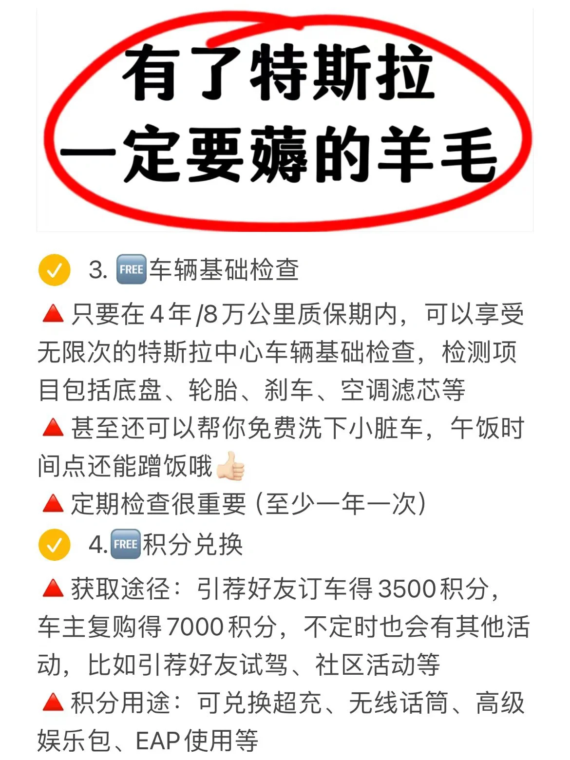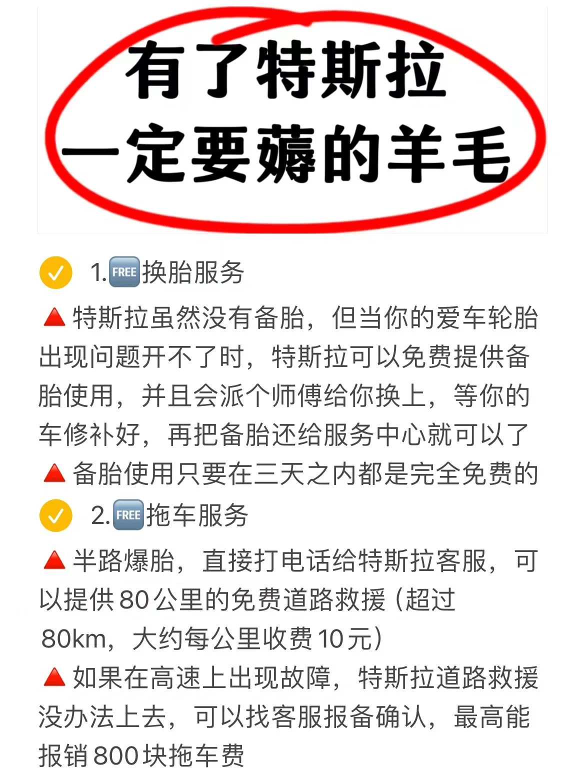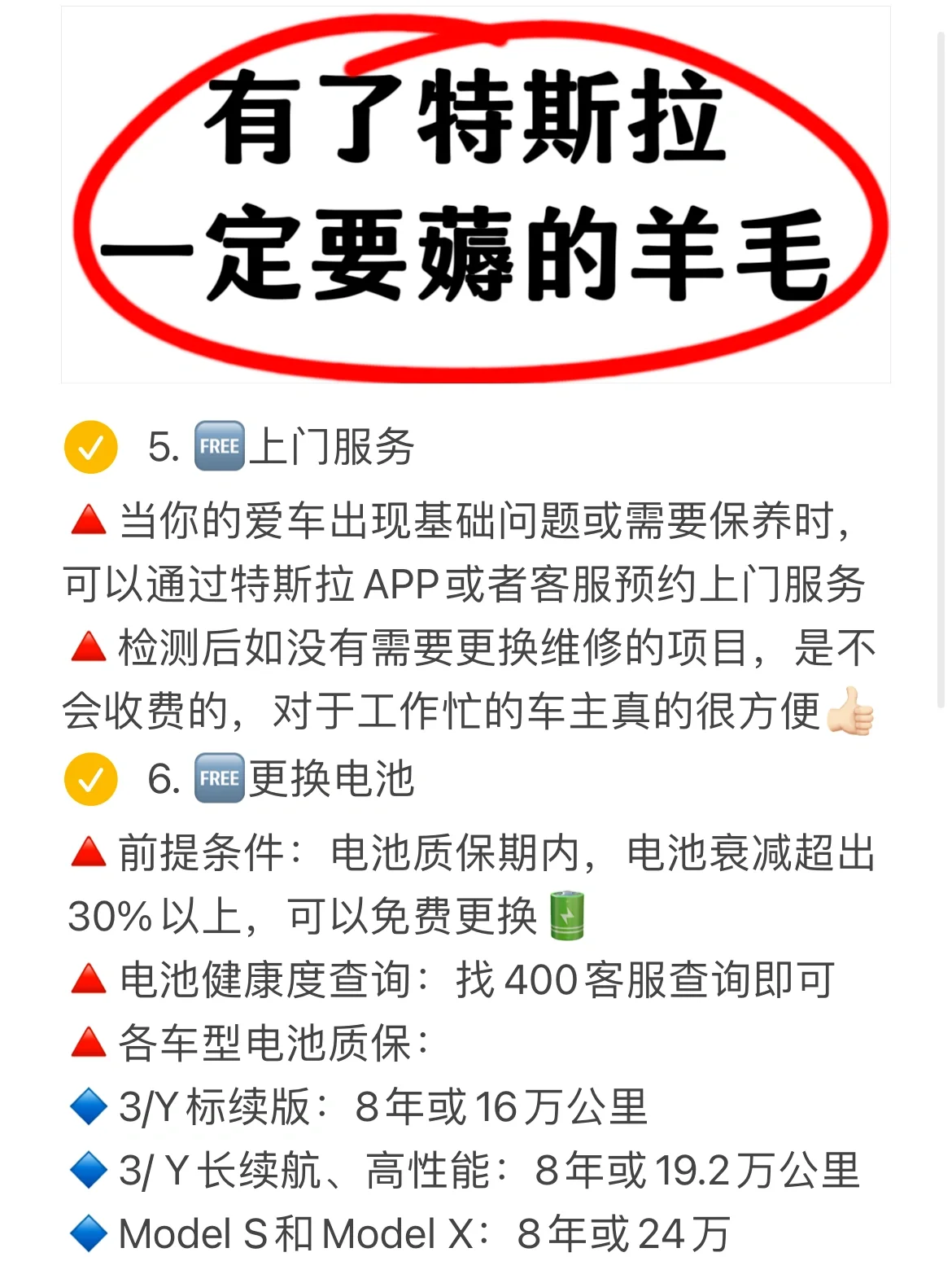 特斯拉提車后 這些頭發(fā) 我不知道,我會失去很多 什么 1.輪胎更換服務 雖然特斯拉沒有備用輪胎,但當您的汽車輪胎出現(xiàn)問題而無法駕駛時,特斯拉可以免費提供備用輪胎,并將派技術(shù)人員為您更換。汽車修好后,您可以將備用輪胎退還給服務中心 備胎在三天內(nèi)完全免費使用 2.車輛牽引 中途爆胎,直接致電特斯拉客服,提供80公里免費道路救援(80公里以上,每公里10元) 如果高速公路發(fā)生故障,特斯拉道路救援無法上去,您可以向客服報告確認,拖車費最高報銷800元 3.車輛基礎(chǔ)檢查 只要保修期為4年/80000公里,您就可以享受無限量的特斯拉中心車輛基本檢查,包括底盤、輪胎、制動器、空調(diào)濾清器等 我甚至可以免費幫你洗臟車,你還可以在午餐時間吃頓飯,對吧 定期檢查很重要,至少每年一次,以使日常使用更放心 4.積分兌換 獲取方式:推薦朋友訂車可獲得3500積分,車主回購可獲得7000積分。此外,還將不定期舉辦其他活動,如推薦朋友試駕、社區(qū)活動等 積分可用于充值、無線麥克風、高級娛樂套餐、EAP使用等 5.現(xiàn)場服務 當您的汽車出現(xiàn)基本問題或需要維修時,您可以通過特斯拉應用程序或客服預約現(xiàn)場服務 如果檢查后沒有需要更換或修理的物品,就不會收費。這對忙碌的車主來說真的方便嗎 6.更換電池 前提條件:在電池保修期內(nèi),如果電池衰減超過30%或以上,是否可以免費更換 電池健康查詢:只需聯(lián)系400客服即可查詢 每種車型的電池保修: 3/Y標準延續(xù)版:8年或160000公里 3/Y遠程、高性能:8年或192000公里 S型和X型:8年或240000公里