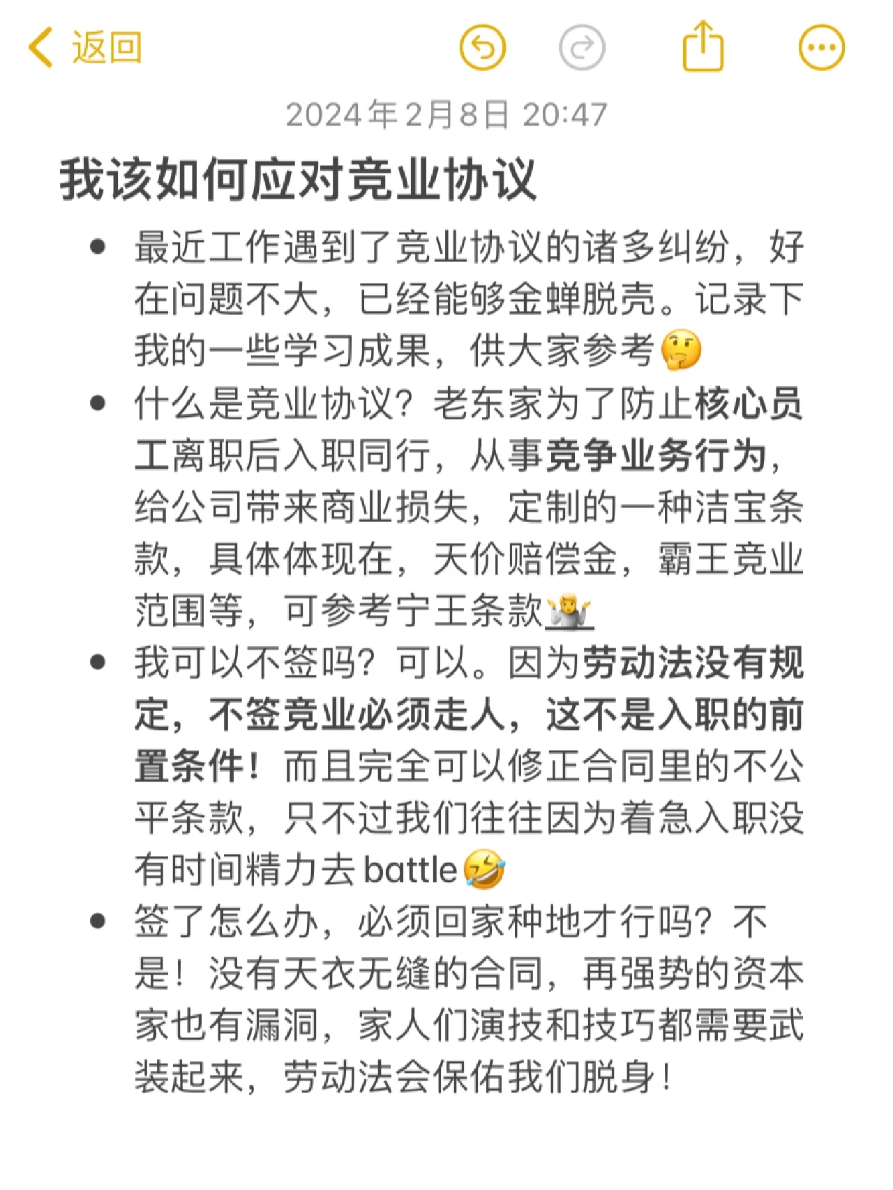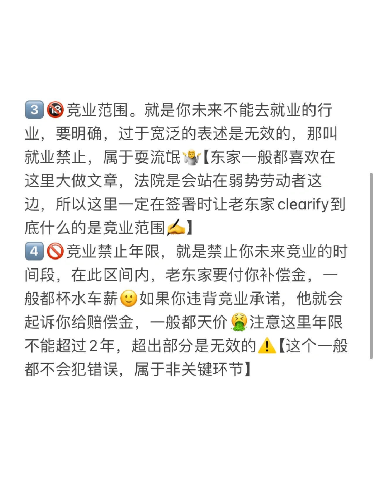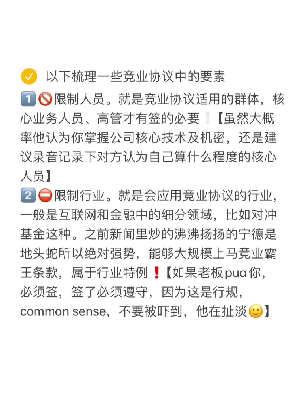 最近,我在工作中遇到了很多關(guān)于競業(yè)禁止協(xié)議的爭議,但幸運的是,問題并不嚴(yán)重,我已經(jīng)成功地解決了它。記錄下我的一些學(xué)習(xí)成果,供大家參考 什么是競業(yè)禁止協(xié)議為了防止核心員工離職后從事競爭性商業(yè)活動,給公司造成業(yè)務(wù)損失,老公司定制了清潔條款 我可以不簽字嗎當(dāng)然因為勞動法中沒有規(guī)定競業(yè)禁止的申請人必須離開,這不是就業(yè)的先決條件! 簽訂合同后我該怎么辦我必須回家種地嗎不沒有無縫的合同,即使是最強大的資本家也有漏洞。家庭成員需要用他們的演技和技能武裝起來,勞動法會保佑我們逃離! 以下是競業(yè)禁止協(xié)議的一些要素,如圖2所 受限人員。競業(yè)禁止協(xié)議適用于該集團,只有核心業(yè)務(wù)人員和高管需要簽署該協(xié)議? 盡管他很可能認(rèn)為你已經(jīng)掌握了公司的核心技術(shù)和秘密,但仍然建議記錄對方對你是什么級別的核心人員的看法 限制行業(yè)。它指的是將適用競業(yè)禁止協(xié)議的行業(yè),通常是互聯(lián)網(wǎng)和金融的一個細(xì)分領(lǐng)域,如對沖基金。此前在新聞中炒作的寧德,是地方龍頭,所以絕對強勢。能夠大規(guī)模推出競爭優(yōu)勢條款是行業(yè)中的一個特例 如果老板想要你,你必須簽字,如果你簽字,你必須遵守,因為這是商業(yè)規(guī)則。常識,別害怕,他在胡說八道 競爭范圍。這是你將來找不到工作的行業(yè)嗎要明確的是,過于寬泛的表述是無效的,這叫禁止就業(yè),屬于耍流氓業(yè)主們通常喜歡在這里大做文章,法院會站在弱勢工人一邊。因此,在簽約時,必須要求老東家澄清競爭范圍是什么? 競業(yè)禁止期是指您在未來被禁止參加比賽的一段時間。在此期間,你的前雇主通常被要求向你支付賠償金,這通常是杯水車薪如果你違反了競業(yè)禁止承諾,他會起訴你要求賠償,通常會花天價請注意,這里的使用壽命不能超過2年,任何超過都無效 這通常不是錯誤,屬于非關(guān)鍵階段