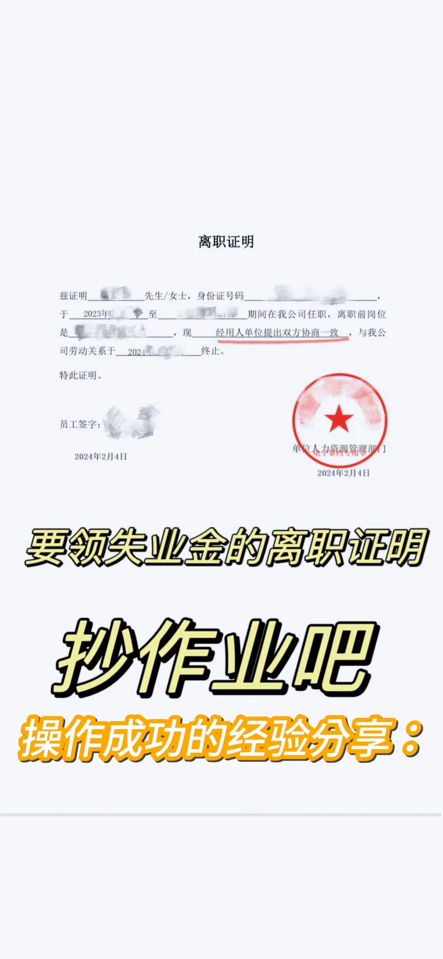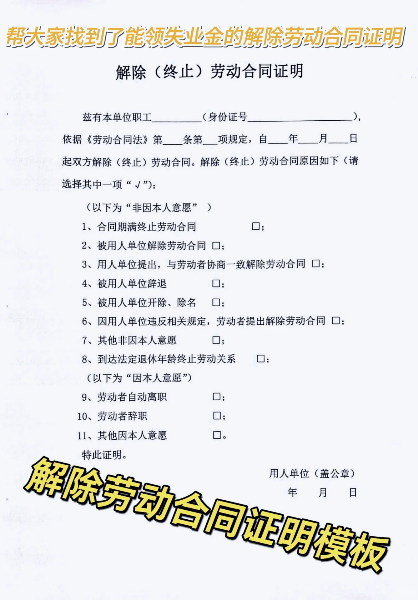 如果你是被辭退、公司裁員、勞動(dòng)合同期滿(mǎn)未續(xù)簽等非本人意愿終止勞動(dòng)關(guān)系的才可以領(lǐng)! 怎么證明是非自愿呢有兩個(gè)辦法: 1.公司在給你們停社保的時(shí)候,由公司選擇是公司的原因?qū)е陆獬齽趧?dòng)關(guān)系(可以和公司協(xié)商,一般公司是不愿意的) 出一份勞動(dòng)解除協(xié)議,如圖,選非本人意愿 ,并加蓋公司的公章(這里如果加蓋合同 章或人力資源部的章都是不可以的 ),這樣 即使公司停社保的時(shí)候選擇了個(gè)人自愿離職,也可以申領(lǐng)以上兩個(gè)條件滿(mǎn)足其中一個(gè)就可以了!最后祝愿所有的失業(yè)人都可以越來(lái)越好,盡早有一份好工作!