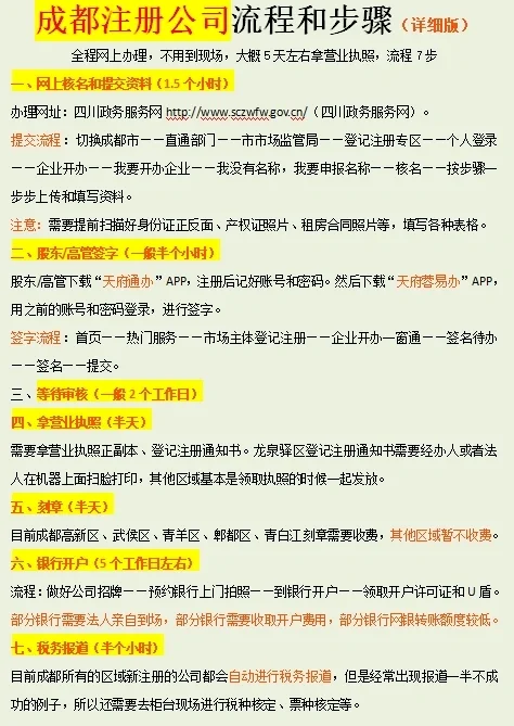 整個過程都是在線處理的,無需前往網(wǎng)站。獲得營業(yè)執(zhí)照大約需要5天,流程為7步 1。在線姓名驗(yàn)證和文件提交(1.5小時) 申請網(wǎng)站:四川省政務(wù)服務(wù)網(wǎng)http://www.sczwfw.gov.cn/(四川省政務(wù)服務(wù)網(wǎng))。 提交流程:切換到成都市-直屬部門-市市場監(jiān)管局-注冊專區(qū)-個人登錄-企業(yè)設(shè)立-我想開辦企業(yè)-我沒有名字,我需要申報(bào)名字-核實(shí)名字-按照步驟逐步上傳和填寫信息。 注意:需要提前掃描身份證正反面、房產(chǎn)證照片、租賃合同照片,并填寫各種表格。 2。股東/高管簽字(通常半小時) 股東/高管應(yīng)下載“天府通辦”應(yīng)用程序,并在注冊后記住他們的賬戶和密碼。然后下載“天府融宜辦”應(yīng)用程序,使用您以前的帳戶和密碼登錄并簽名。 簽約流程:首頁-大眾服務(wù)-市場主體登記-企業(yè)設(shè)立一窗通-簽約辦-簽約提交。 3。等待審查(通常為2個工作日) 4。領(lǐng)取營業(yè)執(zhí)照(半天) 我們需要獲得營業(yè)執(zhí)照的正本和副本,以及登記通知。龍泉驛區(qū)的登記通知要求經(jīng)辦人或法定代表人在機(jī)器上掃描并打印,而在其他地區(qū),通常與許可證一起頒發(fā)。 5。雕刻章(半天) 目前,成都高新區(qū)、武侯區(qū)、青羊區(qū)、郫都區(qū)、青白江等地均需收取印章雕刻費(fèi),其他地區(qū)暫不收取。政策可能隨時調(diào)整。 6。開立銀行賬戶(約5個工作日) 流程:準(zhǔn)備公司標(biāo)牌-與銀行預(yù)約拍照-在銀行開立賬戶-獲得開戶許可證和U型盾牌。一些銀行要求法定代表人親自到場,一些銀行要求開戶費(fèi),一些銀行的網(wǎng)上銀行轉(zhuǎn)賬限額較低。 7。納稅申報(bào)(半小時) 目前,成都所有新注冊的公司都會自動進(jìn)行納稅申報(bào),但經(jīng)常會有一半申報(bào)不成功的情況。因此,有必要到柜臺進(jìn)行現(xiàn)場稅務(wù)和發(fā)票類型驗(yàn)證。