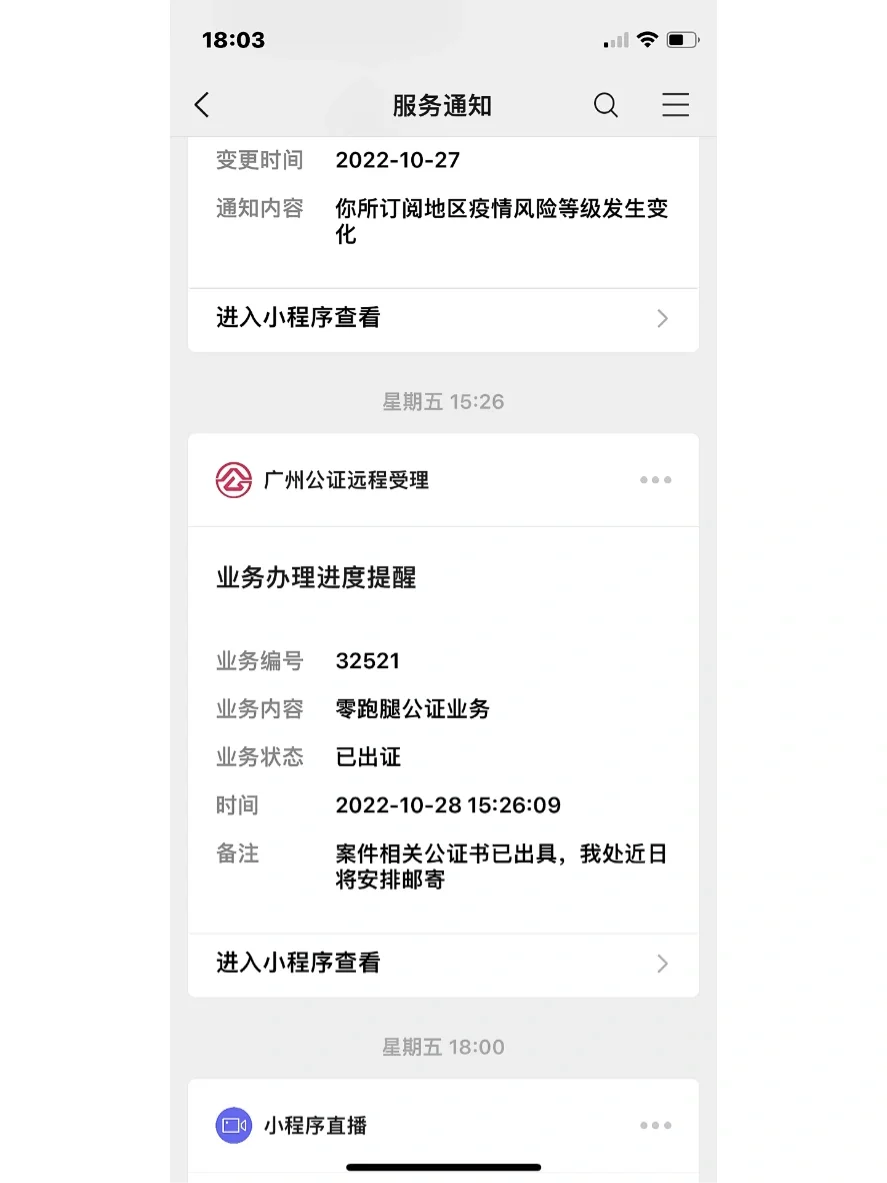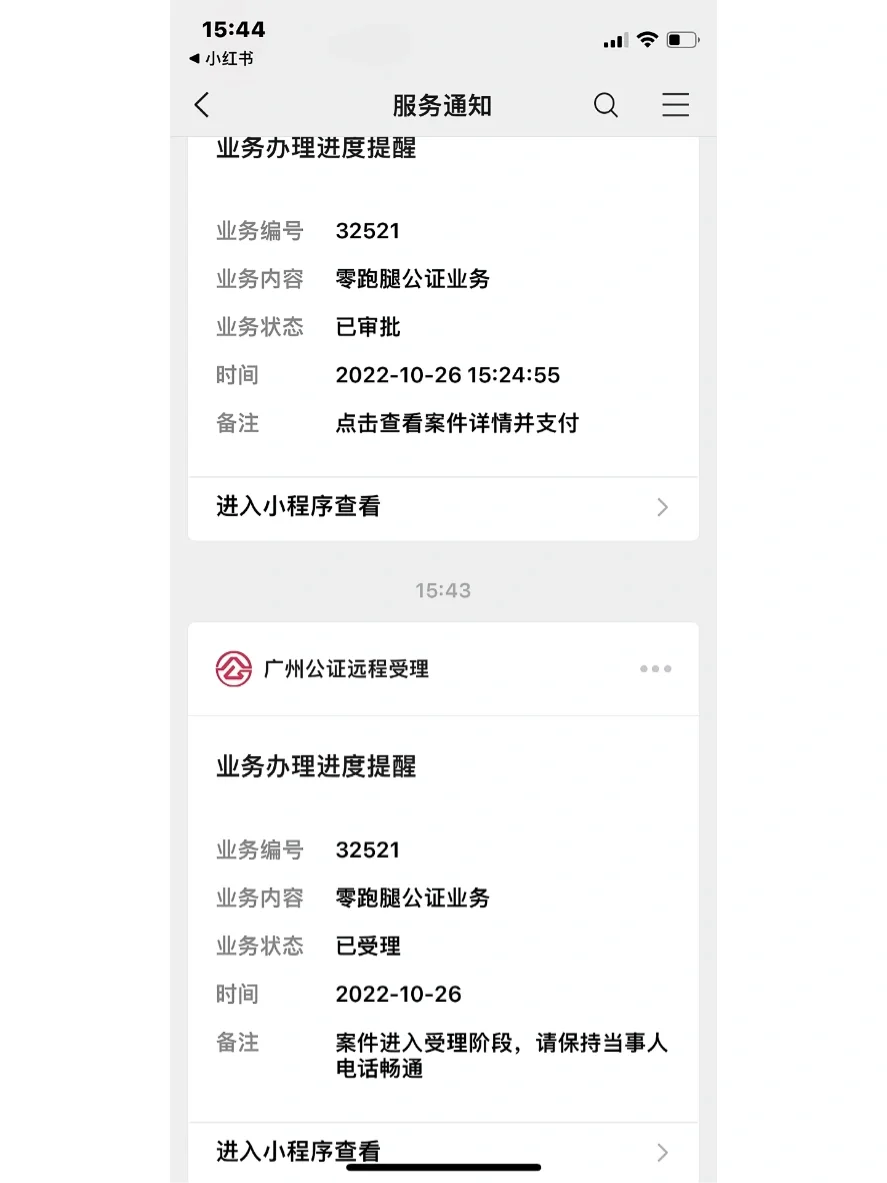 因?yàn)槲倚枰褂脽o犯罪記錄證明和公證文件,但我不能長時間回外地戶籍。在閱讀了提示后,我試著在網(wǎng)上處理它。從申請無犯罪記錄證明到拿到公證書,只需十天時間,我們真正做到了為民零跑腿 以下是一個流程分享,有需要的朋友可以參考: (圖1)廣東省事項(xiàng)目-家庭保障-無犯罪記錄證明。點(diǎn)擊填寫信息,并根據(jù)個人需要提交。前年,我試圖申請,但被拒絕了。幸運(yùn)的是,當(dāng)時我不需要使用。我寫了一份申請表并提交了相關(guān)信息(雖然上面說申請不需要在一年內(nèi)提交三次,但為了順利審核,我還是提交了)。公眾號將推送有關(guān)流程進(jìn)展的信息。圖2是有關(guān)過程進(jìn)度的信息。我是在第三天早上通過電子郵件收到的。犯罪記錄證明的電子檔案! 拿到無犯罪記錄證明后,就可以開始公證了! (圖3)廣州公證員小程序-網(wǎng)上公證申請。點(diǎn)擊它并按照它的流程根據(jù)您的需求填寫相關(guān)信息。記得選擇郵寄公證文件!您無需親自前往或委托他人領(lǐng)取。在提交上述申請后,我于中午11點(diǎn)左右提交了申請。下午2點(diǎn),公證處的工作人員給我打電話詢問了相關(guān)情況,然后加了微信提交了公證所需的文件。我在整個過程中使用的文件都是電子文件(身份證和戶口本),可以從廣東省政府下載 在公證員確認(rèn)沒有問題后,公證員迷你程序?qū)⑻嵝涯犊睿⑻嵝涯鞒痰倪M(jìn)展(圖4和圖5)。您可以隨時查看,然后等待公證書的出具。公證處會直接郵寄給您付款?。▓D6)收到發(fā)票后,發(fā)現(xiàn)工作人員好心地將發(fā)票放在一個文件袋中,并用夾子將其夾在一起 最后,整個過程感覺非常好、快速、方便。