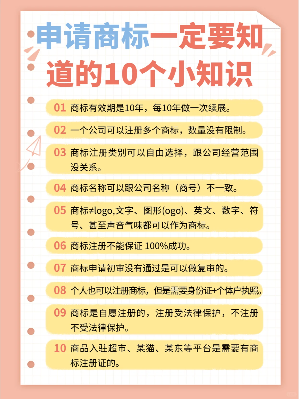 朋友們,今天我就來(lái)給大家講解10個(gè)關(guān)于申請(qǐng)商標(biāo)的晦澀知識(shí),幫助你更加熟練地保護(hù)品牌,遠(yuǎn)離法律風(fēng)險(xiǎn)!來(lái)和我一起看一看! 知識(shí)點(diǎn)1:商標(biāo)的有效期為10年,每10年更新一次。 知識(shí)點(diǎn)2:一個(gè)公司可以注冊(cè)無(wú)數(shù)的商標(biāo),沒有任何限制! 知識(shí)點(diǎn)三:商標(biāo)注冊(cè)類別可以自由選擇,不受公司經(jīng)營(yíng)范圍的限制! 知識(shí)點(diǎn)四:商標(biāo)的名稱可以與公司的名稱不同。回想起什么 知識(shí)點(diǎn)5:個(gè)人也可以注冊(cè)商標(biāo),但申請(qǐng)時(shí)需要攜帶身份證和個(gè)人營(yíng)業(yè)執(zhí)照! 知識(shí)點(diǎn)六:商標(biāo)不僅指標(biāo)志,還包括文字、圖形、英語(yǔ)、數(shù)字、符號(hào),甚至聲音和氣味!什么 知識(shí)點(diǎn)七:商標(biāo)注冊(cè)不能保證100%成功,你需要做好準(zhǔn)備! 知識(shí)點(diǎn)8:商標(biāo)是自愿注冊(cè)的,只有注冊(cè)才能受到法律保護(hù)! 知識(shí)點(diǎn)9:如果你想在超市、天貓和京東等平臺(tái)上儲(chǔ)存你的產(chǎn)品,你必須有商標(biāo)注冊(cè)證書! 知識(shí)點(diǎn)10:如果商標(biāo)申請(qǐng)初審失敗,不要?dú)怵H。你可以繼續(xù)復(fù)查了! 朋友們,關(guān)于申請(qǐng)商標(biāo)注冊(cè)的這些重要知識(shí),你們都掌握了嗎