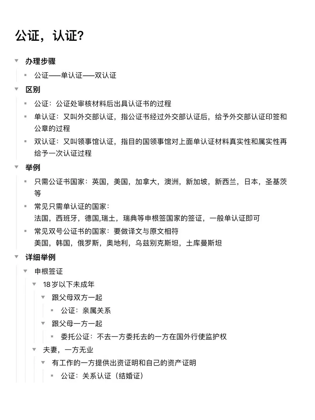 最近我咨詢了很多朋友,他們在申請簽證的時候,有時是公證的,有時是單證的,有時又是雙證的,這讓他們覺得很困惑;今天,我將詳細(xì)談?wù)劰C、單一認(rèn)證和雙重認(rèn)證的區(qū)別,以及處理所需的文件和流程。另外,趁熱分享你處理這件事的經(jīng)驗,大家留著吧! 處理步驟 公證-單一認(rèn)證-雙重認(rèn)證 差別 公證:公證處審核材料后出具證明函的過程 單一認(rèn)證:也稱外交部認(rèn)證,是指公共證書經(jīng)外交部認(rèn)證并加蓋外交部印章進(jìn)行認(rèn)證的過程 雙重認(rèn)證:也稱領(lǐng)事館認(rèn)證,是指目標(biāo)國領(lǐng)事館對上述單一認(rèn)證材料的真實性和真實性提供另一個認(rèn)證過程 說明 只需要經(jīng)過認(rèn)證的國家/地區(qū):英國、美國、加拿大、澳大利亞、新加坡、新西蘭、日本、圣基茨等 僅需要單一身份驗證的常見國家/地區(qū): 申根簽證國家(如法國、西班牙、德國、瑞士、瑞典等)的簽證通常需要單一認(rèn)證 具有雙重編號公證證書的常見國家:翻譯應(yīng)與原文一致 美國、韓國、俄羅斯、奧地利、烏茲別克斯坦、土庫曼斯坦 詳細(xì)示例 申根簽證 18歲以下和成年以下與父母雙方一起 公證:親屬關(guān)系 18歲以下未成年人與父母一方一起 委托公證:不委托對方在境外行使監(jiān)護(hù)權(quán)的一方 夫妻一方失業(yè) 工作組提供出資證明和自身資產(chǎn)證明 公證:關(guān)系證明(結(jié)婚證)