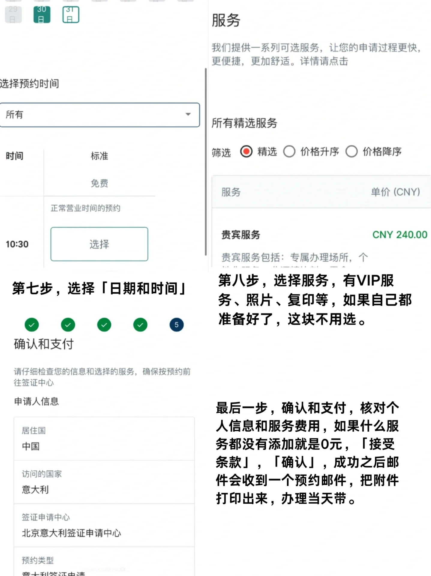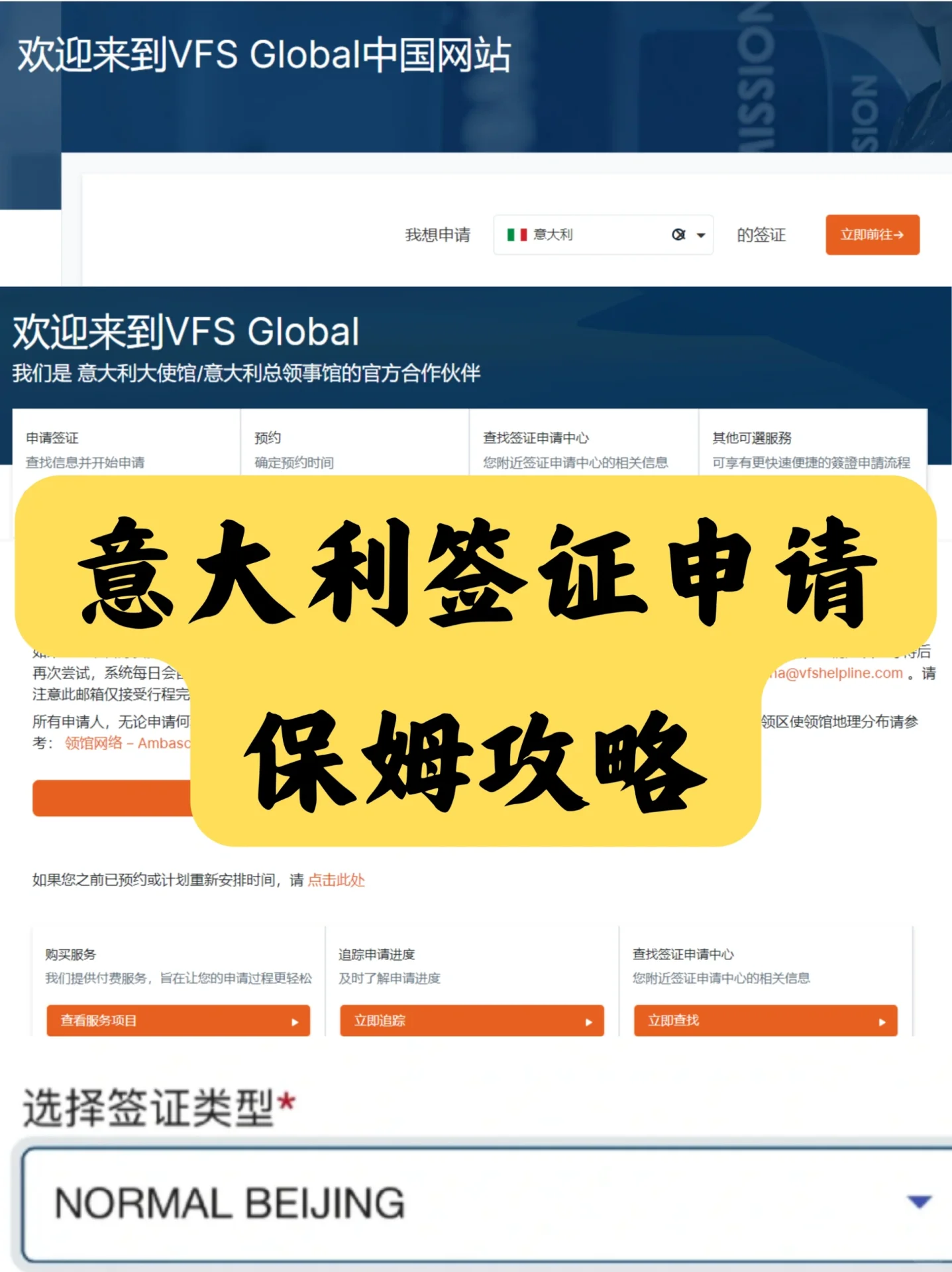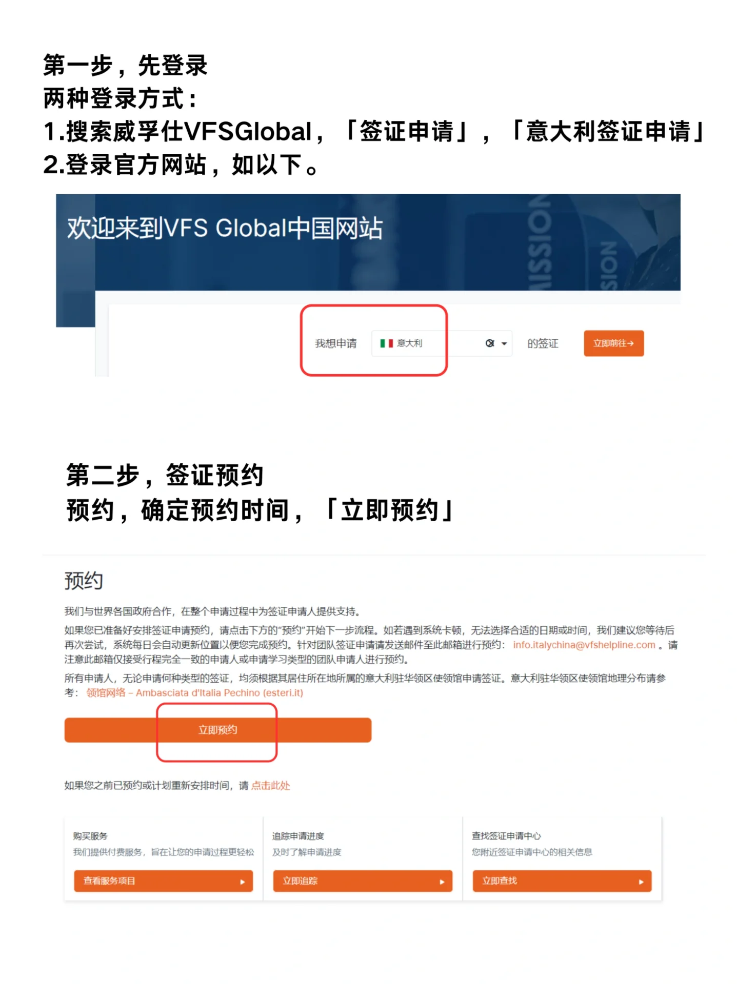 第一步是先登錄 兩種登錄方式: 1.搜索VFS Global,“簽證申請”,“意大利簽證申請” 2.登錄官方網站,如圖2所示。 第二步,預約簽證,確認預約時間,并立即預約 步驟3,登錄或注冊帳戶 登錄帳戶,輸入新注冊的電子郵件和密碼,下面的驗證區(qū)域應該有一個綠色的復選框和“成功”字樣,如下所示。 第四步,進入后,點擊“開始新預約”,選擇簽證申請中心“北京意大利簽證申請中心”。約會類型將自動顯示。選擇簽證類型,最早的預約時間將顯示在“正常北京”下。單擊繼續(xù)。 NORMAL是一個常規(guī)號碼,VIP是一個VIP號碼,大廳里排隊等候該號碼的隊伍是相同的。不同的是,VIP號碼處理區(qū)的人略少,環(huán)境更好,價格略貴。 第五步,添加聯系方式,根據您的護照填寫,然后繼續(xù)下一步。每個注冊帳戶丟失只能添加一個聯系人,并且只能安排一個人。 步驟6,點擊一次性密碼(OTP)生成OTP。驗證碼將發(fā)送到注冊的電子郵件中,并填寫以表示驗證成功。 第7步,選擇日期和時間。 第8步,選擇服務,包括VIP服務、照片、復印件等。如果你已經準備好了,你不需要選擇這個選項。 最后一步是確認并支付、核實個人信息和服務費。如果沒有添加服務,則為0元?!敖邮軛l款”和“確認”。成功后,將收到一封預約電子郵件,附件將在處理的同一天打印出來并隨身攜帶。