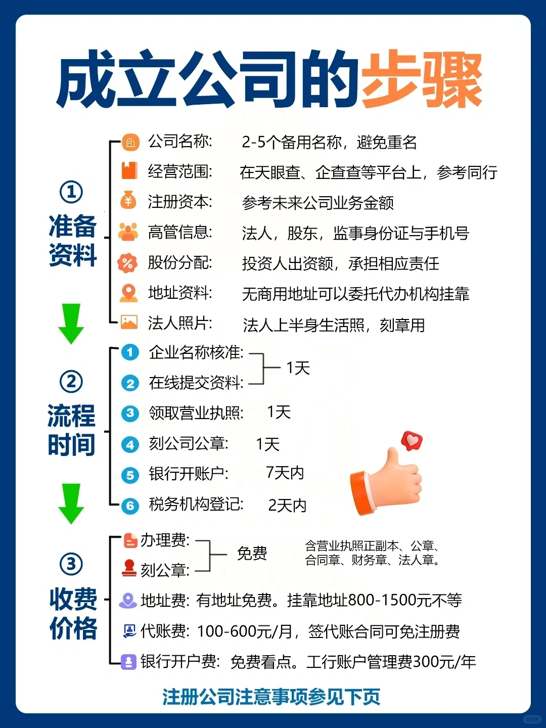 成立公司的步驟,創(chuàng)業(yè)入門指南,一般來說,公司注冊的過程包括:企業(yè)名稱驗證、提交材料、獲取許可證和刻制印章,以完成公司注冊并開始營業(yè)。但對于正在注冊公司的初學者來說,了解如何處理注冊公司時可能遇到的一些問題也是非常重要的。 例如,注冊公司時應注意什么股權(quán)比例如何分配命名公司的原則是什么如何注冊沒有地址的公司 注冊公司的步驟分為三個步驟: 步驟1:準備材料---- 公司名稱:2-5個備選名稱,以避免重復名稱 業(yè)務范圍:在天眼查、洽洽等平臺,指代同行 注冊資本:指公司未來的經(jīng)營金額 高管信息:法定代表人、股東、監(jiān)事身份證及電話 股份分配:投資者應根據(jù)其出資額承擔相應責任 地址信息:如果沒有商業(yè)地址,可以委托機構(gòu)登記 法定代表人照片:法定代表人上身照片,用于刻制印章 步驟2,處理時間---- 企業(yè)名稱審批:1天 網(wǎng)上提交材料:1天 領(lǐng)取營業(yè)執(zhí)照:1天 刻制公司印章:1天 銀行開戶:7天 稅務機關(guān)登記:2天 第3步:費用價格 手續(xù)費:免費 雕刻:免費 地址費:如果有可用的地址,則免費。注冊地址從800元到1500元不等 銀行開戶:免費查看。例如,中國工商銀行的管理費是300元/年 9用于注冊公司 重要注意事項: 1.公司名稱不固定,可以先設立后變更 2.應仔細挑選法定代表人,并確認是否有黑名單 3.虛假地址登記,一旦被工商局發(fā)現(xiàn),將面臨處罰 4.經(jīng)營范圍越多越好,會增加稅種 5.注冊資本越高,承擔的責任越大 6.記住股權(quán)分配的三個比例:67%、51%和34% 7.記得在申請營業(yè)執(zhí)照后30天內(nèi)到稅務機關(guān)登記 8.一個公司只能有一個基本賬戶,但一般賬戶可以有多個 9.即使沒有業(yè)務,公司也需要每月正常報稅(零申報) 注冊公司的股權(quán)分配: 1.67%(三分之二)絕對控制權(quán):公司的重大決策必須經(jīng)代表三分之二多表決權(quán)的股東批準。 2、51%(過半數(shù))相對控制權(quán):除公司重要事項外,其他應由股東大會決定的事項,一般需要股東大會半數(shù)以上股權(quán)同意才能實施。 3.34%(三分之一)的重要事項擁有一票否決權(quán) 4.提議召開臨時股東大會的權(quán)利、主持會議的權(quán)利、提議召開臨時董事會會議的權(quán)利和要求解散公司的權(quán)利的10%(十分之一) 5.低于10% 股東的基本維權(quán)權(quán)利 命名公司的注意事項: 1.提前計劃3-5個名稱進行備份(避免名稱驗證不通過) 2.企業(yè)名稱規(guī)范:行政區(qū)劃+商號+行業(yè)+組織形式。