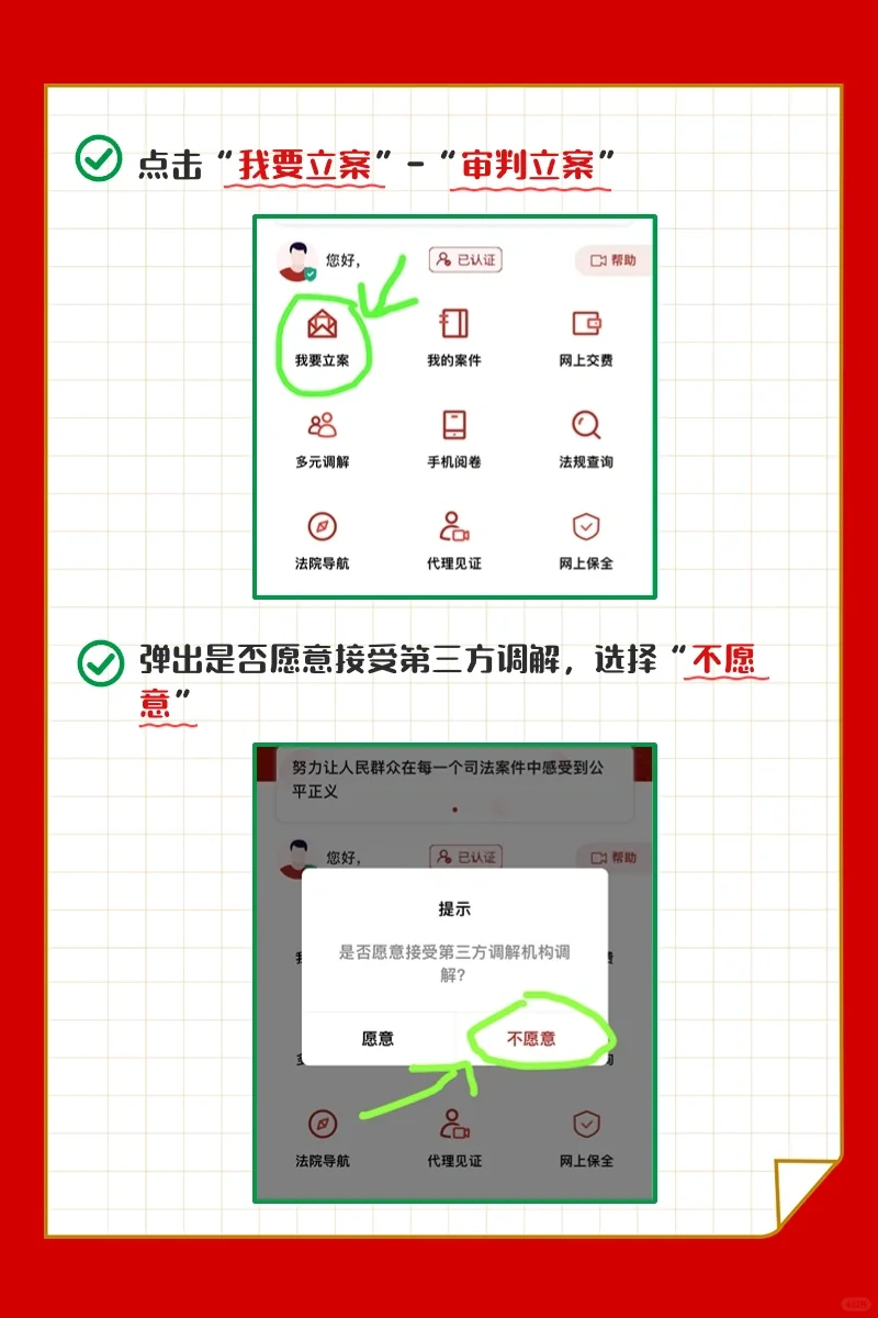 4.彈出是否愿意接受第三方調(diào)解,選擇“不愿意”