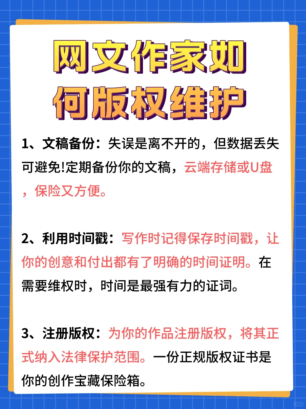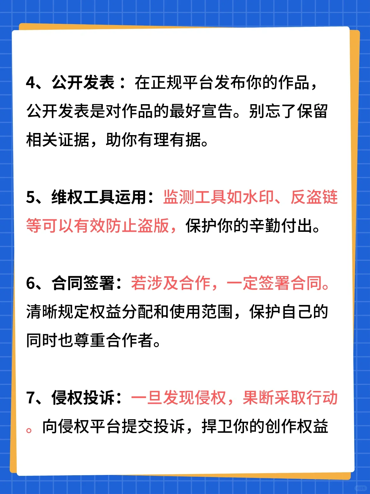 拿起鍵盤,無限創(chuàng)造!網絡作家如何保護版權分享干貨可以幫助你抓住你創(chuàng)作的每一個字! 1.文檔備份:錯誤是不可分割的,但數據丟失是可以避免的!定期備份您的文檔,云存儲或U盤,安全方便! 2.使用時間戳:記得在寫作時保存時間戳,這樣你的創(chuàng)造力和努力就有了明確的時間證明。說到維權,時間是最有力的證明! 3.注冊版權:為您的作品注冊版權,并將其正式納入法律保護范圍。一個合法的版權證書是你的創(chuàng)意寶庫的安全! 4.公開發(fā)表:在合法平臺上發(fā)表你的作品是宣布你的作品的最佳方式。別忘了保存相關證據,幫助你找到理由和證據! 5. 版權保護工具的應用:水印和反盜版鏈等監(jiān)控工具可以有效防止盜版,保護您的辛勤工作。讓小偷無處可逃! 6.合同簽訂:如果涉及合作,必須簽訂合同。明確權益的分配和范圍,在尊重合作者的同時保護自己。 7.侵權投訴:一旦發(fā)現(xiàn)侵權行為,采取果斷行動。向侵權平臺提交投訴以捍衛(wèi)您的創(chuàng)作權利! 總結:網絡創(chuàng)作者需要保護版權,并有訣竅!備份、時間戳、注冊、公開發(fā)布、使用各種工具、簽署合同、提交侵權投訴,幫助您無障礙地創(chuàng)建!