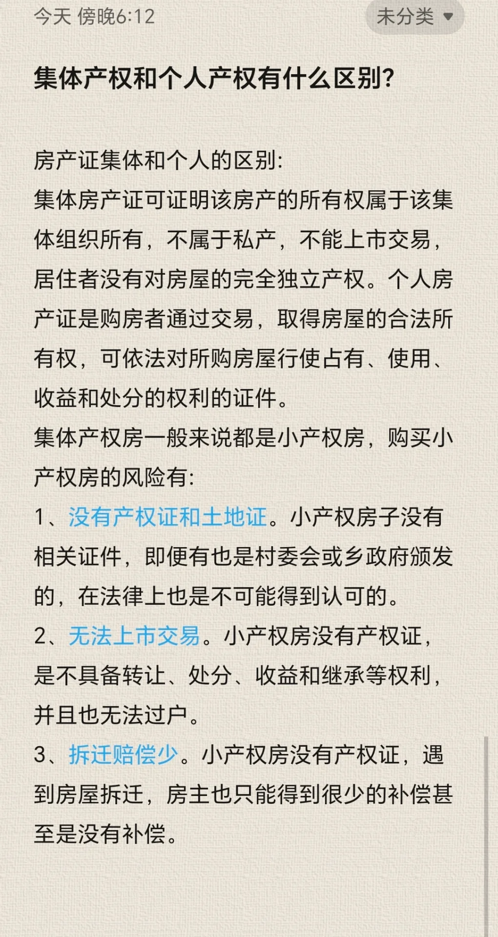 集體產(chǎn)權(quán)和個(gè)人產(chǎn)權(quán)有什么區(qū)別 集體財(cái)產(chǎn)證書(shū)和個(gè)人財(cái)產(chǎn)證書(shū)之間的區(qū)別: 集體財(cái)產(chǎn)證書(shū)可以證明該財(cái)產(chǎn)所有權(quán)屬于集體組織,不是私有財(cái)產(chǎn),不能上市交易,居民對(duì)該財(cái)產(chǎn)不具有完整的獨(dú)立產(chǎn)權(quán)。個(gè)人房產(chǎn)證是購(gòu)房者通過(guò)交易獲得房產(chǎn)合法所有權(quán),并依法行使對(duì)所購(gòu)房產(chǎn)的占有權(quán)、使用權(quán)、收益權(quán)和處分權(quán)的憑證。 集體產(chǎn)權(quán)房一般為小產(chǎn)權(quán)房,購(gòu)買(mǎi)小產(chǎn)權(quán)房的風(fēng)險(xiǎn)包括: 1.無(wú)房產(chǎn)證、土地證。沒(méi)有相關(guān)文件的小產(chǎn)權(quán)房,即使是村委會(huì)或鄉(xiāng)鎮(zhèn)政府出具的,也不被法律承認(rèn)。 2.無(wú)法上市交易。沒(méi)有產(chǎn)權(quán)證的小產(chǎn)權(quán)房沒(méi)有轉(zhuǎn)讓、處分、收益、繼承的權(quán)利,不能轉(zhuǎn)讓。 3、拆遷補(bǔ)償減少。小產(chǎn)權(quán)房沒(méi)有產(chǎn)權(quán)證,一旦拆遷,房主只能得到很少或根本沒(méi)有補(bǔ)償。