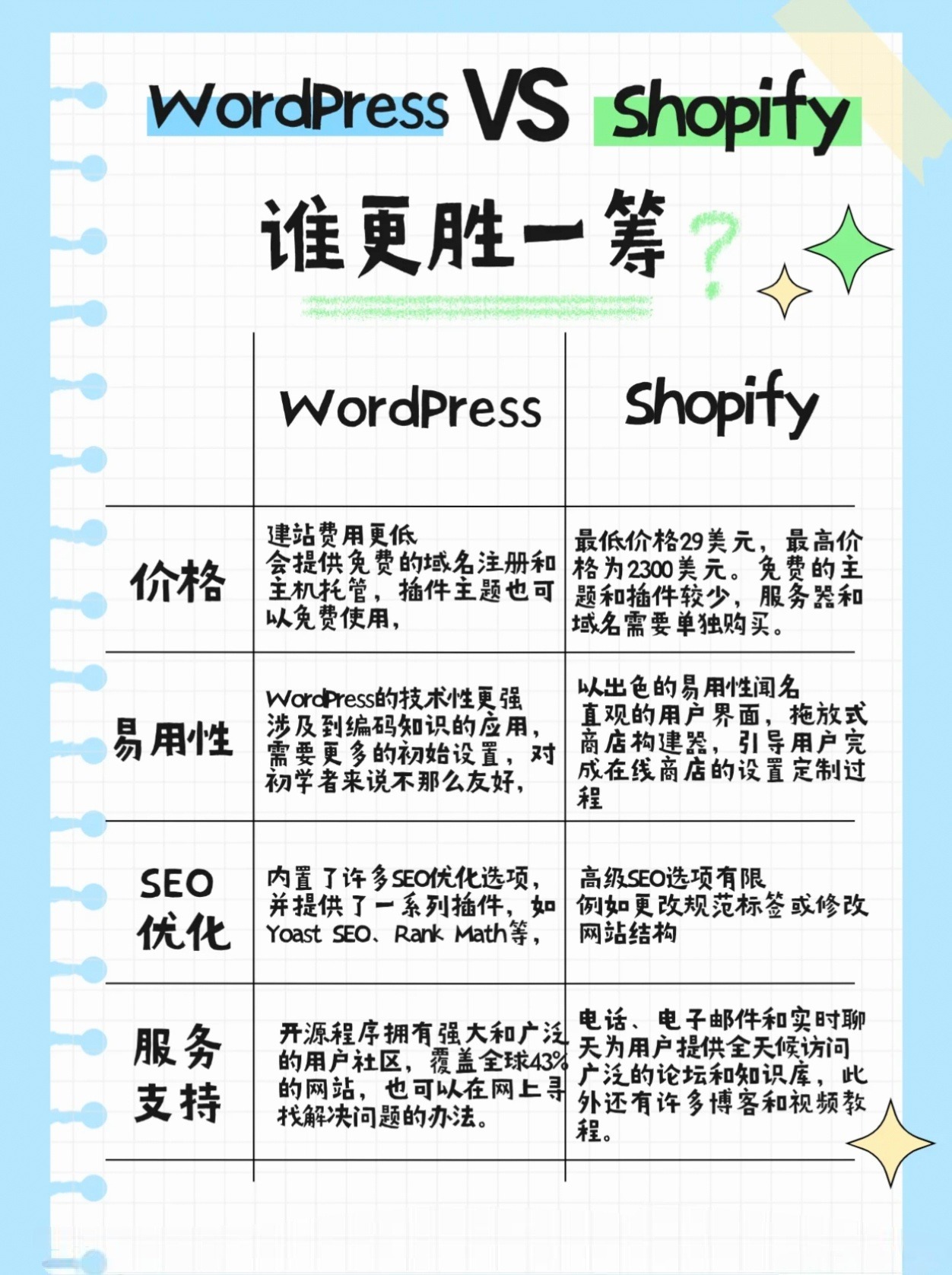 1、價格:WordPress建站費(fèi)用更低 2、易用性:WordPress更適合有技術(shù)背景的用戶,Shopify易用性更加突出 3、SEO優(yōu)化:Shopify的高級SEO功能可能不如WordPress 4、服務(wù)支持:二者的服務(wù)支持都比較好用 5、安全穩(wěn)定性:WordPress的安全性取決于用戶自己的防護(hù)設(shè)置,Shopify提供了較完善的安全防護(hù) 6、網(wǎng)站設(shè)計:二者處于相對平等的地位,不過WordPress定制性更強(qiáng)