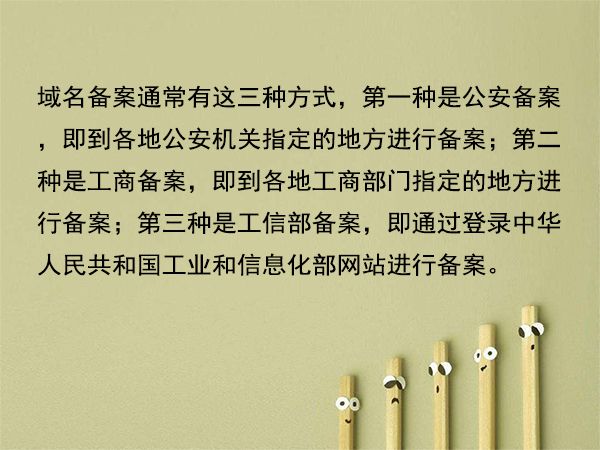域名備案通常有這三種方式,第一種是公安備案,即到各地公安機關指定的地方進行備案;第二種是工商備案,即到各地工商部門指定的地方進行備案;第三種是工信部備案,即通過登錄中華人民共和國工業(yè)和信息化部網(wǎng)站進行備案。