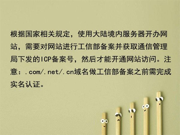 注意:工信部備案和公安部備案沒有先后順序關系,但是在完成了工信部備案后的30天內(nèi)需完成公安部備案。另外,.com/.net/.cn域名未實名認證也可以進行公安部備案,但是在公安備案期間若該域名因未實名導致網(wǎng)站無法訪問時,公安備案將無法審核通過,所以建議您完成實名認證再完成公安備案。