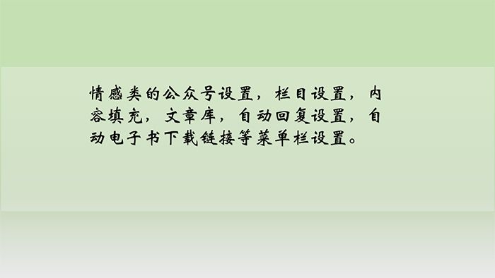 1、情感類的公眾號(hào)設(shè)置,欄目設(shè)置,內(nèi)容填充,文章庫(kù),自動(dòng)回復(fù)設(shè)置,自動(dòng)電子書下載鏈接等菜單欄設(shè)置。