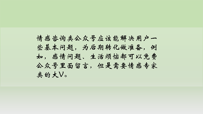 2、情感咨詢類公眾號(hào)應(yīng)該能解決用戶一些基本問(wèn)題,為后期轉(zhuǎn)化做準(zhǔn)備,例如,感情問(wèn)題、生活煩惱都可以免費(fèi)公眾號(hào)里面留言,但是需要情感專家類的大V。