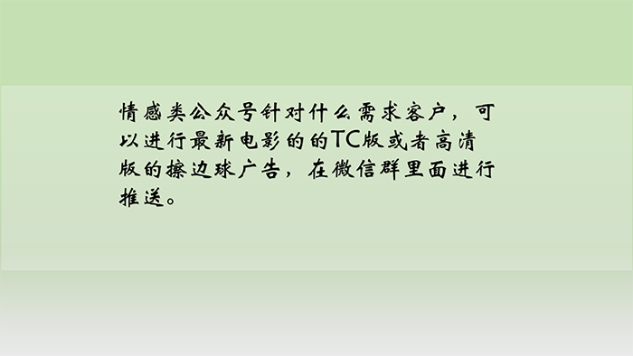 5、情感類公眾號(hào)針對(duì)什么需求客戶,可以進(jìn)行最新電影的的TC版或者高清版的擦邊球廣告,在微信群里面進(jìn)行推送。