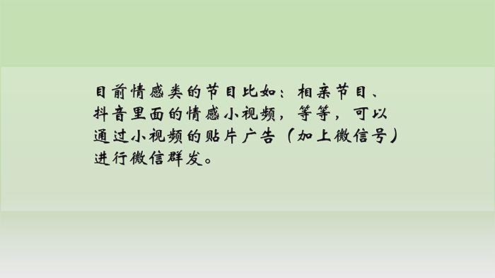 7、目前情感類的節(jié)目比如:相親節(jié)目、抖音里面的情感小視頻,等等,可以通過(guò)小視頻的貼片廣告(加上微信號(hào))進(jìn)行微信群發(fā)。