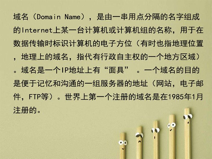 域名(Domain Name),是由一串用點(diǎn)分隔的名字組成的Internet上某一臺(tái)計(jì)算機(jī)或計(jì)算機(jī)組的名稱,用于在數(shù)據(jù)傳輸時(shí)標(biāo)識(shí)計(jì)算機(jī)的電子方位(有時(shí)也指地理位置,地理上的域名,指代有行政自主權(quán)的一個(gè)地方區(qū)域)。域名是一個(gè)IP地址上有“面具” 。一個(gè)域名的目的是便于記憶和溝通的一組服務(wù)器的地址(網(wǎng)站,電子郵件,F(xiàn)TP等)。世界上第一個(gè)注冊(cè)的域名是在1985年1月注冊(cè)的。