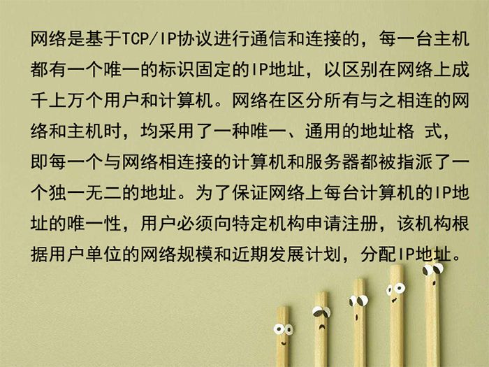 網(wǎng)絡(luò)是基于TCP/IP協(xié)議進(jìn)行通信和連接的,每一臺(tái)主機(jī)都有一個(gè)唯一的標(biāo)識(shí)固定的IP地址,以區(qū)別在網(wǎng)絡(luò)上成千上萬個(gè)用戶和計(jì)算機(jī)。網(wǎng)絡(luò)在區(qū)分所有與之相連的網(wǎng)絡(luò)和主機(jī)時(shí),均采用了一種唯一、通用的地址格 式,即每一個(gè)與網(wǎng)絡(luò)相連接的計(jì)算機(jī)和服務(wù)器都被指派了一個(gè)獨(dú)一無二的地址。為了保證網(wǎng)絡(luò)上每臺(tái)計(jì)算機(jī)的IP地址的唯一性,用戶必須向特定機(jī)構(gòu)申請(qǐng)注冊(cè),該機(jī)構(gòu)根據(jù)用戶單位的網(wǎng)絡(luò)規(guī)模和近期發(fā)展計(jì)劃,分配IP地址。