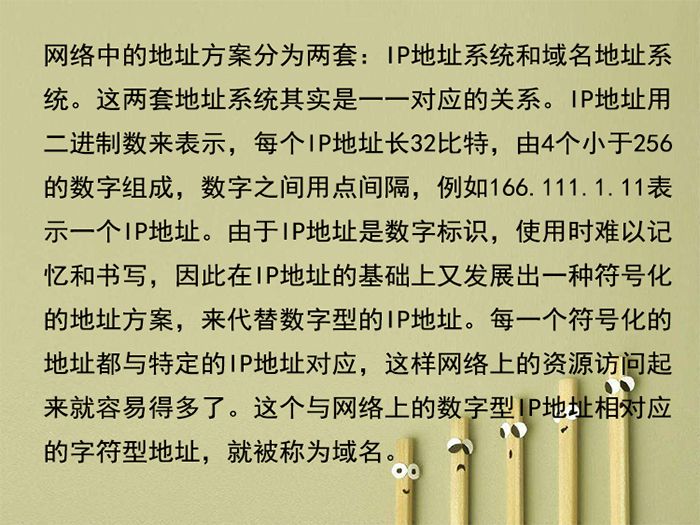 網(wǎng)絡(luò)中的地址方案分為兩套:IP地址系統(tǒng)和域名地址系統(tǒng)。這兩套地址系統(tǒng)其實(shí)是一一對(duì)應(yīng)的關(guān)系。IP地址用二進(jìn)制數(shù)來表示,每個(gè)IP地址長(zhǎng)32比特,由4個(gè)小于256的數(shù)字組成,數(shù)字之間用點(diǎn)間隔,例如166.111.1.11表示一個(gè)IP地址。由于IP地址是數(shù)字標(biāo)識(shí),使用時(shí)難以記憶和書寫,因此在IP地址的基礎(chǔ)上又發(fā)展出一種符號(hào)化的地址方案,來代替數(shù)字型的IP地址。每一個(gè)符號(hào)化的地址都與特定的IP地址對(duì)應(yīng),這樣網(wǎng)絡(luò)上的資源訪問起來就容易得多了。這個(gè)與網(wǎng)絡(luò)上的數(shù)字型IP地址相對(duì)應(yīng)的字符型地址,就被稱為域名。