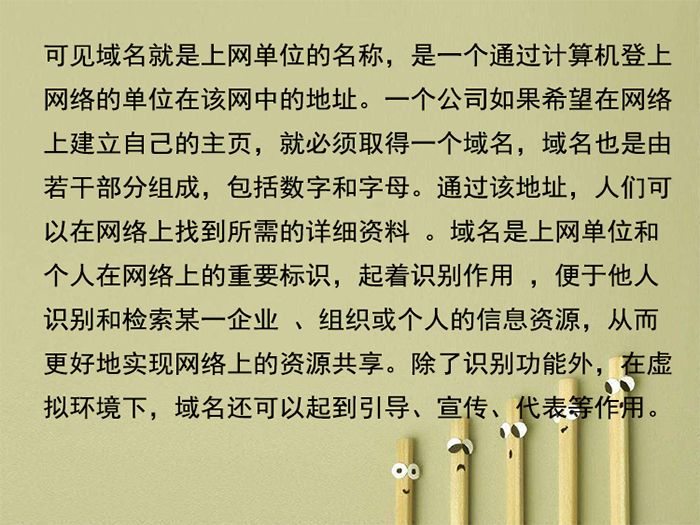 可見域名就是上網(wǎng)單位的名稱,是一個(gè)通過計(jì)算機(jī)登上網(wǎng)絡(luò)的單位在該網(wǎng)中的地址。一個(gè)公司如果希望在網(wǎng)絡(luò)上建立自己的主頁,就必須取得一個(gè)域名,域名也是由若干部分組成,包括數(shù)字和字母。通過該地址,人們可以在網(wǎng)絡(luò)上找到所需的詳細(xì)資料 。域名是上網(wǎng)單位和個(gè)人在網(wǎng)絡(luò)上的重要標(biāo)識(shí),起著識(shí)別作用 ,便于他人識(shí)別和檢索某一企業(yè) 、組織或個(gè)人的信息資源,從而更好地實(shí)現(xiàn)網(wǎng)絡(luò)上的資源共享。除了識(shí)別功能外,在虛擬環(huán)境下,域名還可以起到引導(dǎo)、宣傳、代表等作用。