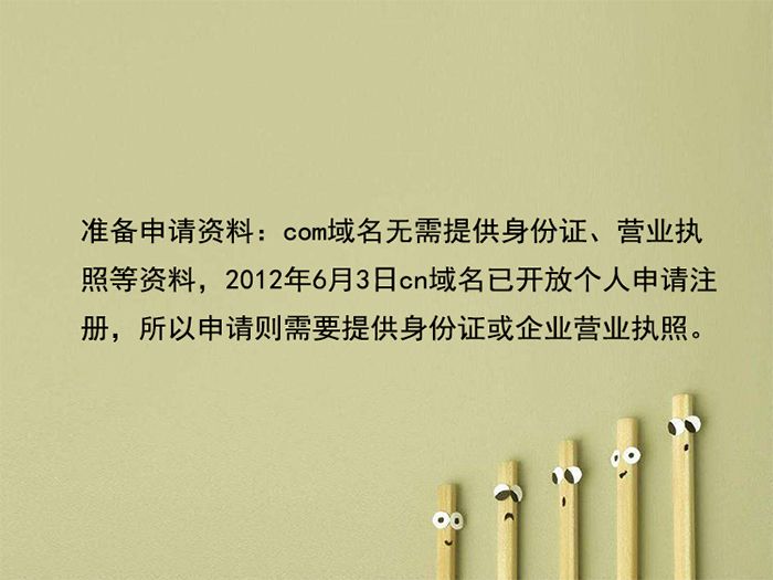 1、準(zhǔn)備申請資料:com域名無需提供身份證、營業(yè)執(zhí)照等資料,2012年6月3日cn域名已開放個人申請注冊,所以申請則需要提供身份證或企業(yè)營業(yè)執(zhí)照。