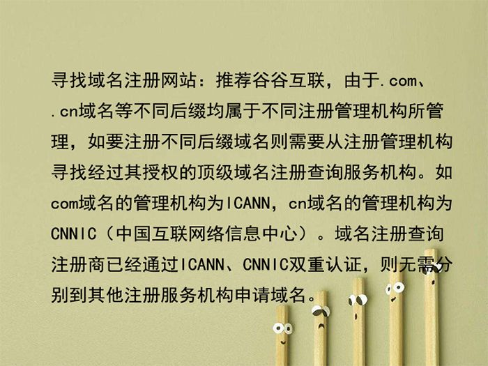 2、尋找域名注冊網(wǎng)站:由于.com、.cn域名等不同后綴均屬于不同注冊管理機構(gòu)所管理,如要注冊不同后綴域名則需要從注冊管理機構(gòu)尋找經(jīng)過其授權(quán)的頂級域名注冊查詢服務(wù)機構(gòu)。如com域名的管理機構(gòu)為ICANN,cn域名的管理機構(gòu)為CNNIC(中國互聯(lián)網(wǎng)絡(luò)信息中心)。域名注冊查詢注冊商已經(jīng)通過ICANN、CNNIC雙重認(rèn)證,則無需分別到其他注冊服務(wù)機構(gòu)申請域名。