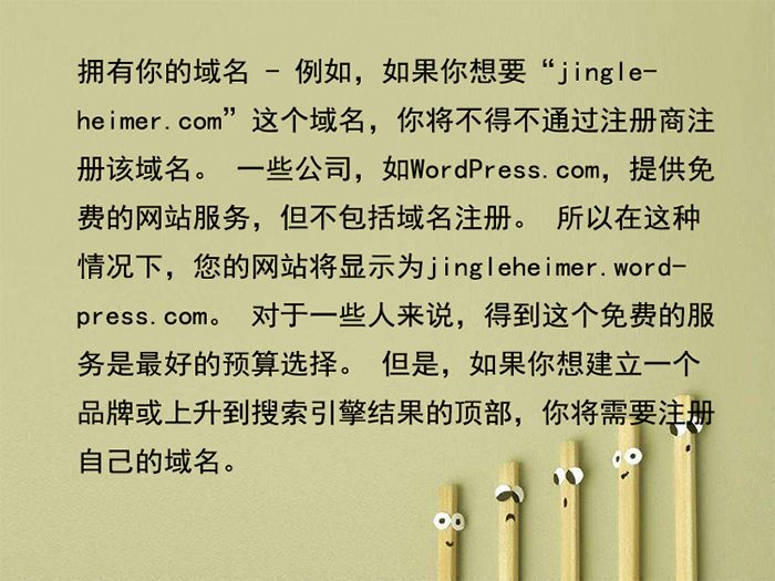 1. 擁有你的域名 - 例如,如果你想要“ningtui.com”這個(gè)域名,你將不得不通過(guò)注冊(cè)商注冊(cè)該域名。 一些公司,提供免費(fèi)的網(wǎng)站服務(wù),但不包括域名注冊(cè)。 對(duì)于一些人來(lái)說(shuō),得到這個(gè)免費(fèi)的服務(wù)是最好的預(yù)算選擇。 但是,如果你想建立一個(gè)品牌或上升到搜索引擎結(jié)果的頂部,你將需要注冊(cè)自己的域名。