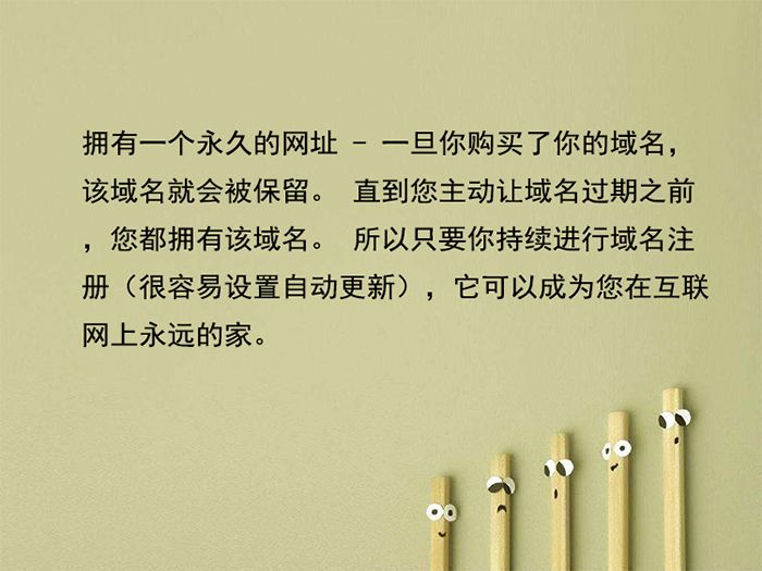 2.擁有一個(gè)永久的網(wǎng)址 - 一旦你購(gòu)買(mǎi)了你的域名,該域名就會(huì)被保留。 直到您主動(dòng)讓域名過(guò)期之前,您都擁有該域名。 所以只要你持續(xù)進(jìn)行域名注冊(cè)(很容易設(shè)置自動(dòng)更新),它可以成為您在互聯(lián)網(wǎng)上永遠(yuǎn)的家。