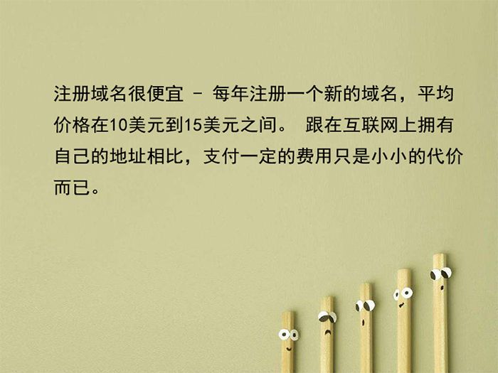 3.注冊(cè)域名很便宜 - 每年注冊(cè)一個(gè)新的域名,平均價(jià)格在10美元到15美元之間。 跟在互聯(lián)網(wǎng)上擁有自己的地址相比,支付一定的費(fèi)用只是小小的代價(jià)而已。