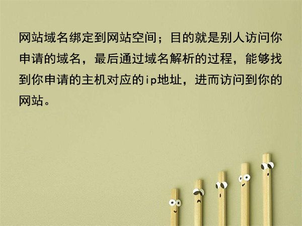 3、網(wǎng)站域名綁定到網(wǎng)站空間;目的就是別人訪問(wèn)你申請(qǐng)的域名,最后通過(guò)域名解析的過(guò)程,能夠找到你申請(qǐng)的主機(jī)對(duì)應(yīng)的ip地址,進(jìn)而訪問(wèn)到你的網(wǎng)站。