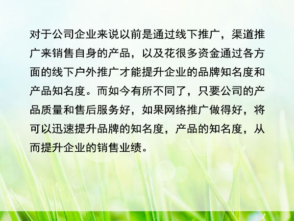 對于公司企業(yè)來說以前是通過線下推廣,渠道推廣來銷售自身的產品,以及花很多資金通過各方面的線下戶外推廣才能提升企業(yè)的品牌知名度和產品知名度。而如今有所不同了,只要公司的產品質量和售后服務好,如果通過建設網(wǎng)站,從而網(wǎng)絡推廣做得好,將可以迅速提升品牌的知名度,產品的知名度,從而提升企業(yè)的銷售業(yè)績。