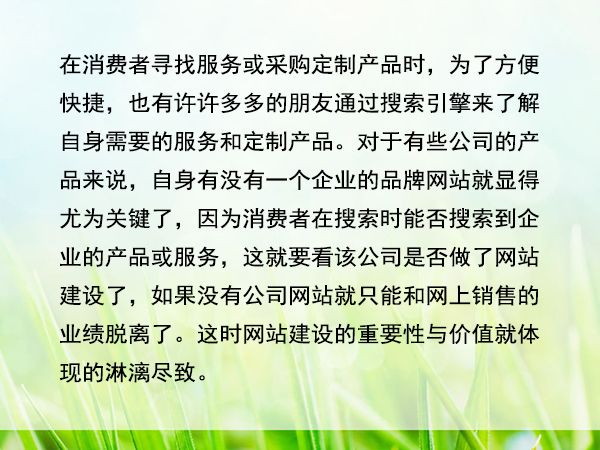 在消費者尋找服務或采購定制產品時,為了方便快捷,也有許許多多的朋友通過搜索引擎來了解自身需要的服務和定制產品。對于有些公司的產品來說,自身有沒有一個企業(yè)的品牌網(wǎng)站就顯得尤為關鍵了,因為消費者在搜索時能否搜索到企業(yè)的產品或服務,這就要看該公司是否做了網(wǎng)站建設了,如果沒有公司網(wǎng)站就只能和網(wǎng)上銷售的業(yè)績脫離了。這時網(wǎng)站建設的重要性與價值就體現(xiàn)的淋漓盡致。