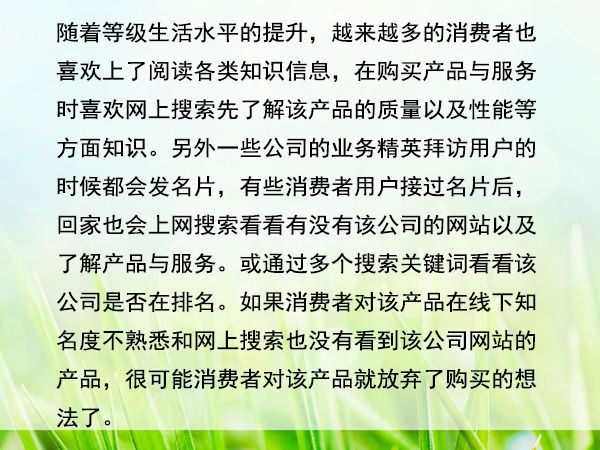隨著等級生活水平的提升,越來越多的消費者也喜歡上了閱讀各類知識信息,在購買產品與服務時喜歡網(wǎng)上搜索先了解該產品的質量以及性能等方面知識。另外一些公司的業(yè)務精英拜訪用戶的時候都會發(fā)名片,有些消費者用戶接過名片后,回家也會上網(wǎng)搜索看看有沒有該公司的網(wǎng)站以及了解產品與服務?;蛲ㄟ^多個搜索關鍵詞看看該公司是否在排名。如果消費者對該產品在線下知名度不熟悉和網(wǎng)上搜索也沒有看到該公司網(wǎng)站的產品,很可能消費者對該產品就放棄了購買的想法了。