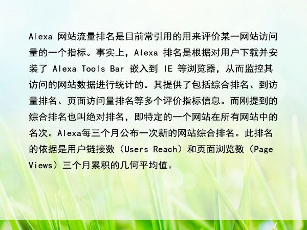 Alexa 網(wǎng)站流量排名是目前常引用的用來(lái)評(píng)價(jià)某一網(wǎng)站訪問(wèn)量的一個(gè)指標(biāo)。事實(shí)上,Alexa 排名是根據(jù)對(duì)用戶(hù)下載并安裝了 Alexa Tools Bar 嵌入到 IE 等瀏覽器,從而監(jiān)控其訪問(wèn)的網(wǎng)站數(shù)據(jù)進(jìn)行統(tǒng)計(jì)的。其提供了包括綜合排名、到訪量排名、頁(yè)面訪問(wèn)量排名等多個(gè)評(píng)價(jià)指標(biāo)信息。而剛提到的綜合排名也叫絕對(duì)排名,即特定的一個(gè)網(wǎng)站在所有網(wǎng)站中的名次。Alexa每三個(gè)月公布一次新的網(wǎng)站綜合排名。此排名的依據(jù)是用戶(hù)鏈接數(shù)(Users Reach)和頁(yè)面瀏覽數(shù)(Page Views)三個(gè)月累積的幾何平均值。