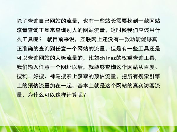 除了查詢(xún)自己網(wǎng)站的流量,也有一些站長(zhǎng)需要找到一款網(wǎng)站流量查詢(xún)工具來(lái)查詢(xún)別人的網(wǎng)站流量,這時(shí)候我們應(yīng)該用什么工具呢? 就目前來(lái)說(shuō),互聯(lián)網(wǎng)上還沒(méi)有一款功能能夠真正準(zhǔn)確的查詢(xún)到任意一個(gè)網(wǎng)站的流量,但是有一些工具還是可以查詢(xún)網(wǎng)站的大概流量的,比如chinaz的權(quán)重查詢(xún)工具,我們輸入任意一個(gè)網(wǎng)址以后,就能夠查詢(xún)這個(gè)網(wǎng)站從百度、搜狗、好搜、神馬搜索上獲取的預(yù)估流量,把所有搜索引擎上的預(yù)估流量加在一起,基本上就是這個(gè)網(wǎng)站的真實(shí)訪客流量,為什么可以這樣計(jì)算呢?