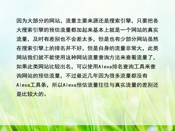 因?yàn)榇蟛糠值木W(wǎng)站,流量主要來(lái)源還是搜索引擎,只要把各大搜索引擎的預(yù)估流量都加起來(lái)基本上就是一個(gè)網(wǎng)站的真實(shí)流量,及時(shí)有差別也不會(huì)差太多,但是也有少部分網(wǎng)站雖然在搜索引擎上的排名并不好,但是自身的流量非常大,此類(lèi)網(wǎng)站我們就不能使用這種網(wǎng)站流量查詢(xún)方法來(lái)查看流量了,如果此類(lèi)網(wǎng)站比較出名,可以使用Alexa排名查詢(xún)工具來(lái)查詢(xún)網(wǎng)站的預(yù)估流量,不過(guò)最近幾年因?yàn)楹芏嗔髁慷紱](méi)有Alexa工具條,所以Alexa預(yù)估流量往往與真實(shí)流量的差別還是比較大的。