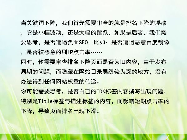 1.當關(guān)鍵詞下降,我們首先需要審查的就是排名下降的浮動,它是小幅波動,還是大幅的跳躍,如果是后者,我們需要思考,是否遭遇負面SEO,比如:是否遭遇惡意百度鏡像,是否被惡意的刷IP點擊率……