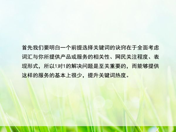 首先我們要明白一個(gè)前提選擇關(guān)鍵詞的訣竅在于全面考慮詞匯與你所提供產(chǎn)品或服務(wù)的相關(guān)性、網(wǎng)民關(guān)注程度、表現(xiàn)形式,所以1對(duì)1的解決問題是至關(guān)重要的,而能夠提供這樣的服務(wù)的基本上很少,提升關(guān)鍵詞熱度。