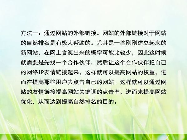 方法一:通過網(wǎng)站的外部鏈接。網(wǎng)站的外部鏈接對(duì)于網(wǎng)站的自然排名是有極大幫助的。尤其是一些剛剛建立起來的新網(wǎng)站,在網(wǎng)上含笑出來的概率可能比較少,因此這時(shí)候就需要是先找一個(gè)合作伙伴,然后讓這個(gè)合作伙伴把自己的網(wǎng)絡(luò)IP友情鏈接起來,這樣就可以提高網(wǎng)站的權(quán)重,進(jìn)而在提高那些用戶去點(diǎn)擊自己的網(wǎng)站。這樣就可以通過網(wǎng)站的友情鏈接提高網(wǎng)站關(guān)鍵詞的點(diǎn)擊率,進(jìn)而來提高網(wǎng)站優(yōu)化,從而達(dá)到提高自然排名的目的。