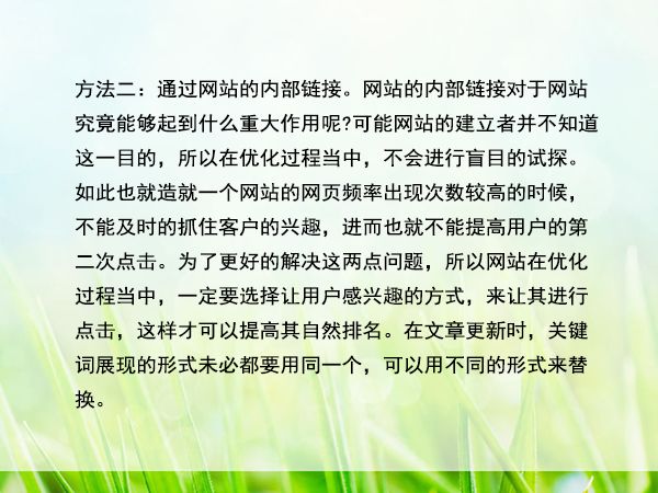 方法二:通過網(wǎng)站的內(nèi)部鏈接。網(wǎng)站的內(nèi)部鏈接對(duì)于網(wǎng)站究竟能夠起到什么重大作用呢?可能網(wǎng)站的建立者并不知道這一目的,所以在優(yōu)化過程當(dāng)中,不會(huì)進(jìn)行盲目的試探。如此也就造就一個(gè)網(wǎng)站的網(wǎng)頁頻率出現(xiàn)次數(shù)較高的時(shí)候,不能及時(shí)的抓住客戶的興趣,進(jìn)而也就不能提高用戶的第二次點(diǎn)擊。為了更好的解決這兩點(diǎn)問題,所以網(wǎng)站在優(yōu)化過程當(dāng)中,一定要選擇讓用戶感興趣的方式,來讓其進(jìn)行點(diǎn)擊,這樣才可以提高其自然排名。在文章更新時(shí),關(guān)鍵詞展現(xiàn)的形式未必都要用同一個(gè),可以用不同的形式來替換。