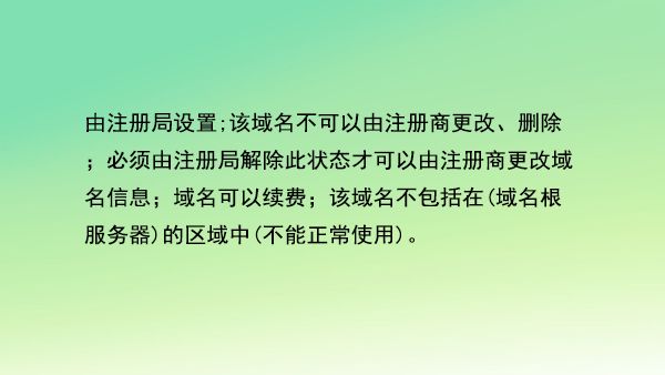3、REGISTRY-HOLD 注冊局保留:由注冊局設(shè)置;該域名不可以由注冊商更改、刪除;必須由注冊局解除此狀態(tài)才可以由注冊商更改域名信息;域名可以續(xù)費(fèi);該域名不包括在(域名根服務(wù)器)的區(qū)域中(不能正常使用)。