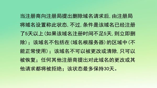 6、REDEMPTIONPERIOD 寬限期:當(dāng)注冊商向注冊局提出刪除域名請求后,由注冊局將域名設(shè)置稱此狀態(tài),不過,條件是該域名已經(jīng)注冊了5天以上(如果該域名注冊時間不足5天,則立即刪除);該域名不包括在(域名根服務(wù)器)的區(qū)域中(不能正常使用);該域名不可以被更改或清除,只可以被恢復(fù);任何其他注冊商提出對此域名的更改或其他請求都將被拒絕;該狀態(tài)最多保持30天。
