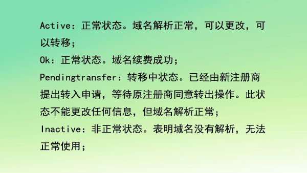這些英文表示了域名當(dāng)前持有所處的狀態(tài),讀懂這些狀態(tài)所表示的意思是非常重要的,能幫你辨清域名的擁有狀態(tài)、更能幫你擇機(jī)成功搶注域名。